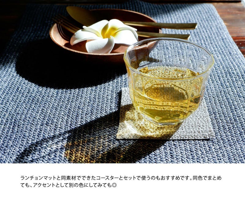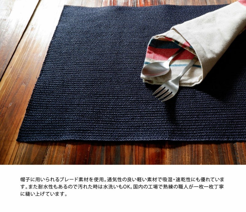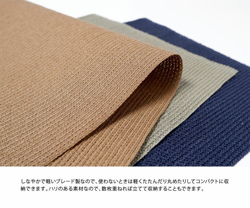 ブレードのナチュラルな質感を楽しめるレクタングル(長方形)ランチョンマット。いつものテーブルに置くだけでちょっと特別感のあるダイニングに変身!食卓以外にも使えるシンプルなデザインと、豊富なカラーバリエーションがあなたのおうち時間に彩りを添えてくれます。帽子に用いられるブレード素材を使用。通気性の良い軽い素材で吸湿・速乾性にも優れています。また耐水性もあるので汚れた時は水洗いもOK。国内の工場で熟練の職人が一枚一枚丁寧に縫い上げています。しなやかで軽いブレード製なので、使わないときは軽くたたんだり丸めたりしてコンパクトに収納できます。ハリのある素材なので、数枚重ねれば立てて収納することもできます。