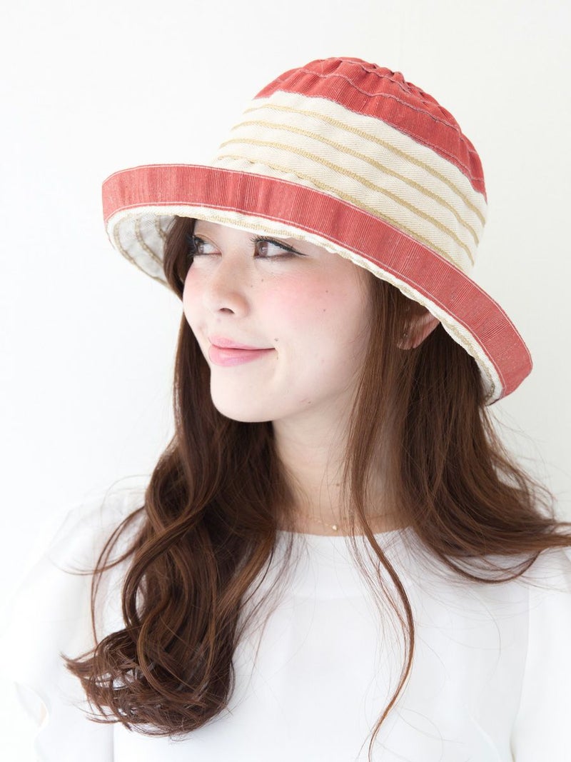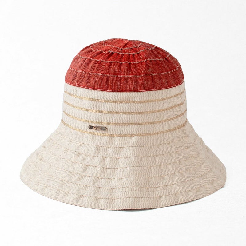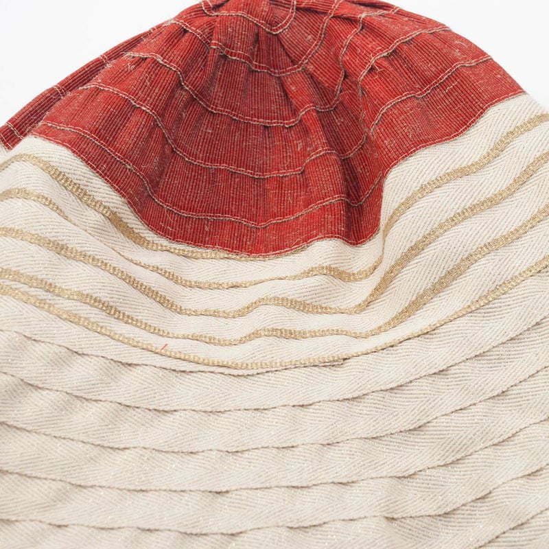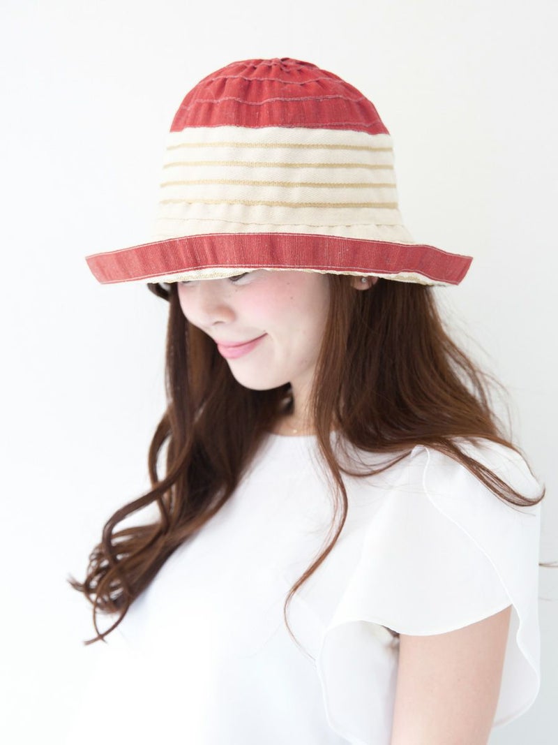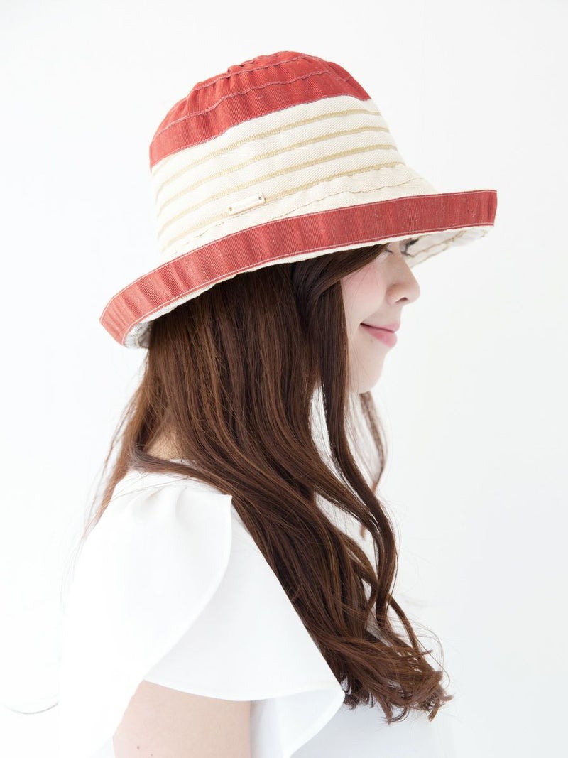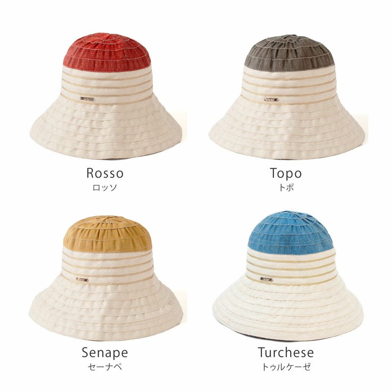 テープ状の生地をぐるぐると巻き上げて作るブレード製法で作られたコットンキャペリン。この製法では光が当たると独特の光沢感がうまれ、エレガントで上品な雰囲気になります。デザインがシンプルなのでいろいろなお洋服に合わせやすいのも特長です。素材にもイタリア製ならではのこだわりがあり、品質や色合いなどきめ細かい選定を行い、デザインに合った素材選びがなされています。生地はシャリ感のある固めの肌触りで、夏に合った爽やかな感触です。ブレードの縁には刺繍がほどこされており、民族模様を思わせるエレガントな仕上がり。明るいレッド(ロッソ)と引き締まったカーキ(トポ)柔らかいイエロー(セーナペ)に加え、爽やかなブルー(トゥルケーゼ)を合わせた4色展開。レッドとイエローは明るい印象を与え、カーキやブルーは被るとお顔が引き締まった印象になります。