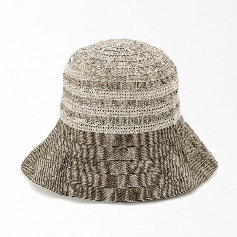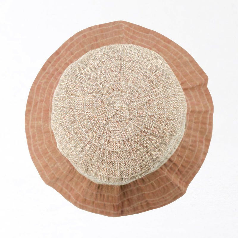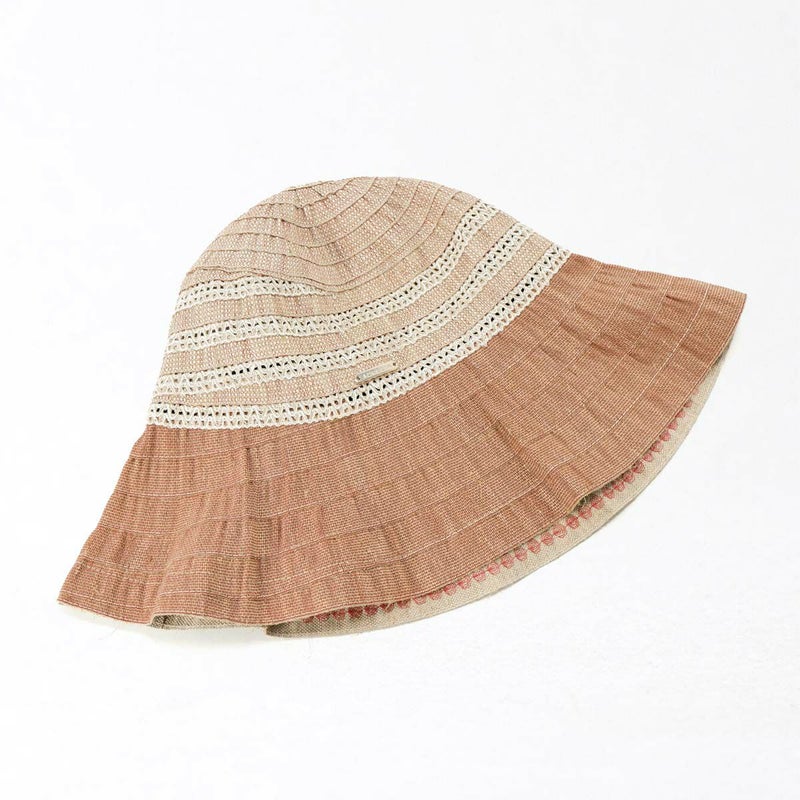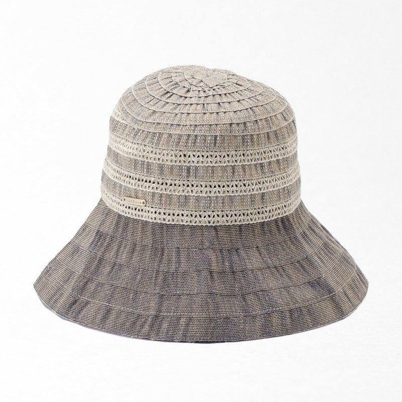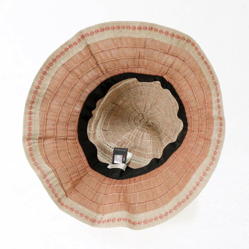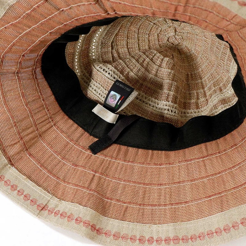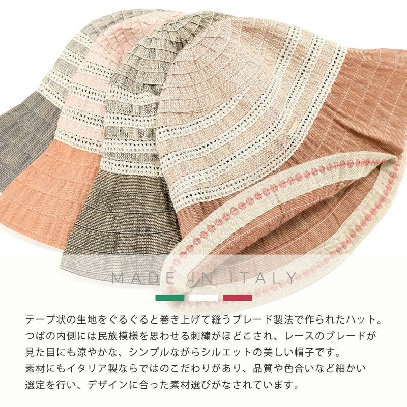 テープ状の生地をぐるぐると巻き上げて縫うブレード製法で作られたハット。つばの内側には民族模様を思わせる刺繍がほどこされ、レースのブレードが見た目にも涼やかな、シンプルながらシルエットの美しい帽子です。素材にもイタリア製ならではのこだわりがあり、品質や色合いなど細かい選定を行い、デザインに合った素材選びがなされています。帽子内側のスベリ(ビン革)部分にアジャスターが付いているのでお好みのサイズ感で被れ、使わないときは折りたたんでコンパクトに持ち運べます。シンプルなデザインなのでカジュアルからエレガントまで幅広いスタイルに合わせられる帽子です。