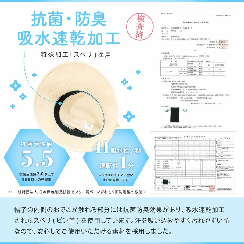 麻とブレードの組み合わせが、洗練された印象を与えるアイテム。フロントには本体と同素材のリボンが施されており、エレガントな印象を与えます。通気性に優れた素材を使用しているため、暑い日でも快適に過ごすことができます。さらに、吸水速乾性と抗菌防臭機能を備えたスベリ(ビン革)を使用、汗をかいてもすぐに乾き、いつでも清潔に保つことができます。折りたたみ可能で持ち運びに便利なため、旅行やアウトドアにも最適。手洗いが可能なので、ご家庭で簡単にお手入れでき、いつでも気持ちよくお使いいただけます。また、頭まわりのサイズ調整が可能で、ぴったりとフィットする快適な着用感を実現します。日常使いはもちろん、特別な日のお出かけにも最適な、スタイリッシュで機能的な帽子です。