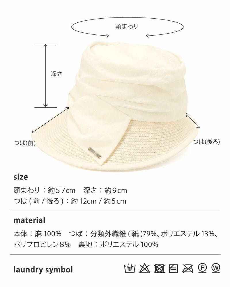【素材】本体:麻100% / つば:分類外繊維(紙):79%、ポリエステル13%、ポリプロピレン:8% / 裏地:ポリエステル100%