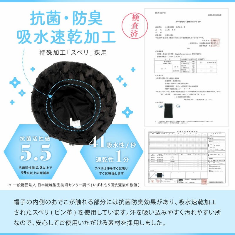 シェブロンとボーダーの組み合わせが特徴的な、立体感のある生地が独特の表情を醸し出すバケットハット。帽子の内側のスベリ(ビン革)部分には抗菌防臭・吸汗速乾素材を使用、汗をかきやすい暑い日でも快適に被れます。軽量で折りたたみできるので持ち運びにも便利です。手洗いOKなのでご家庭で簡単にお手入れでき、末長くご愛用いただけるアイテムです。