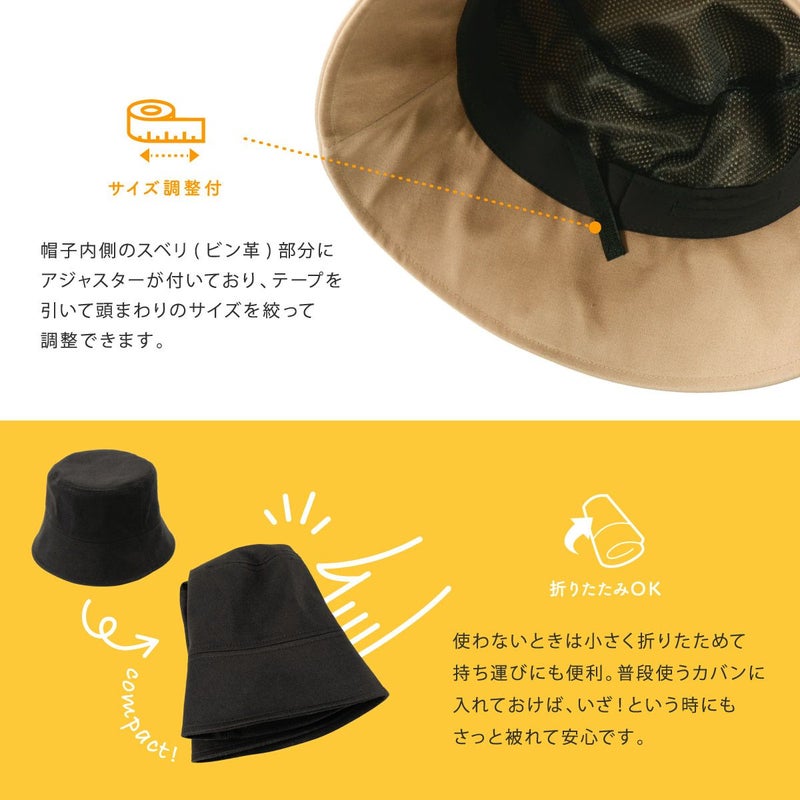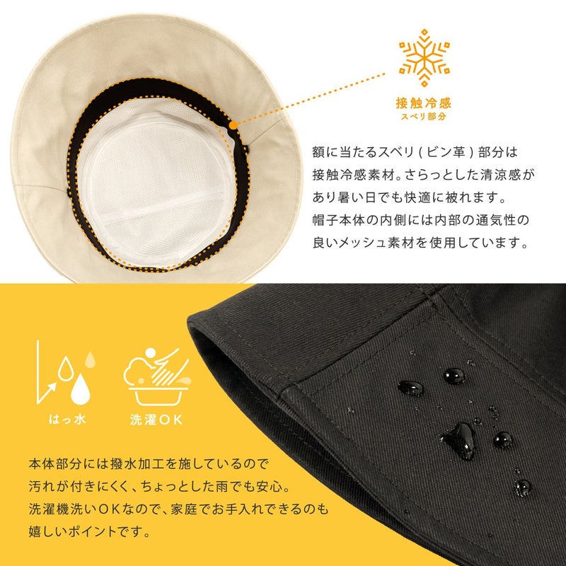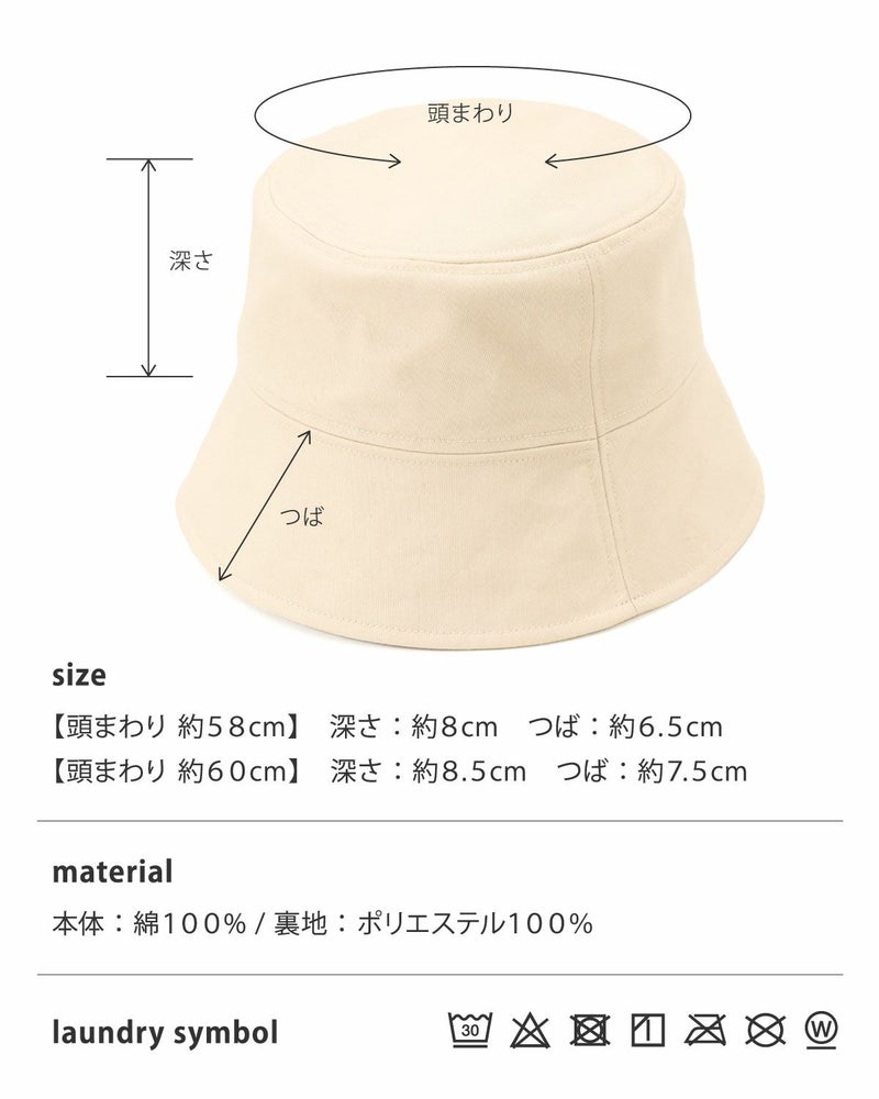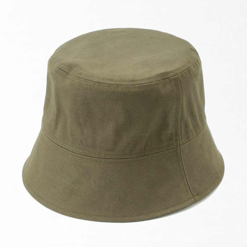 お手入れしやすいコットンツイルのバケットハット。シンプルで季節を通してお使い頂けるアイテムです。ステッチの少ないシンプルで上品なデザインで、カジュアルなバケハも大人っぽくきまります。カジュアルからキレイめまでオシャレの幅が広がります。深めでつばの広がりが少ない型でトレンド感のあるスタイリングに。スッキリとコンパクトにまとまったシルエットは普段使いしやすく、アウトドアやスポーツをするときにも活躍する便利なアイテムです。撥水加工を施しているので、多少の雨はもちろん、暑い日に気になる汗染みも目立ちにくくなっています!マジックテープ式のアジャスター付でサイズ調整も簡単です。