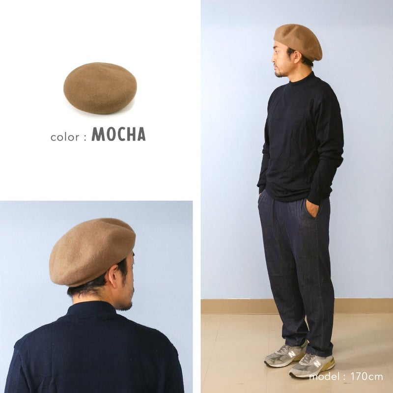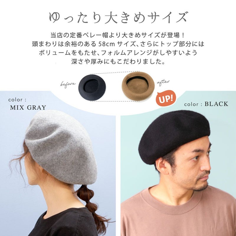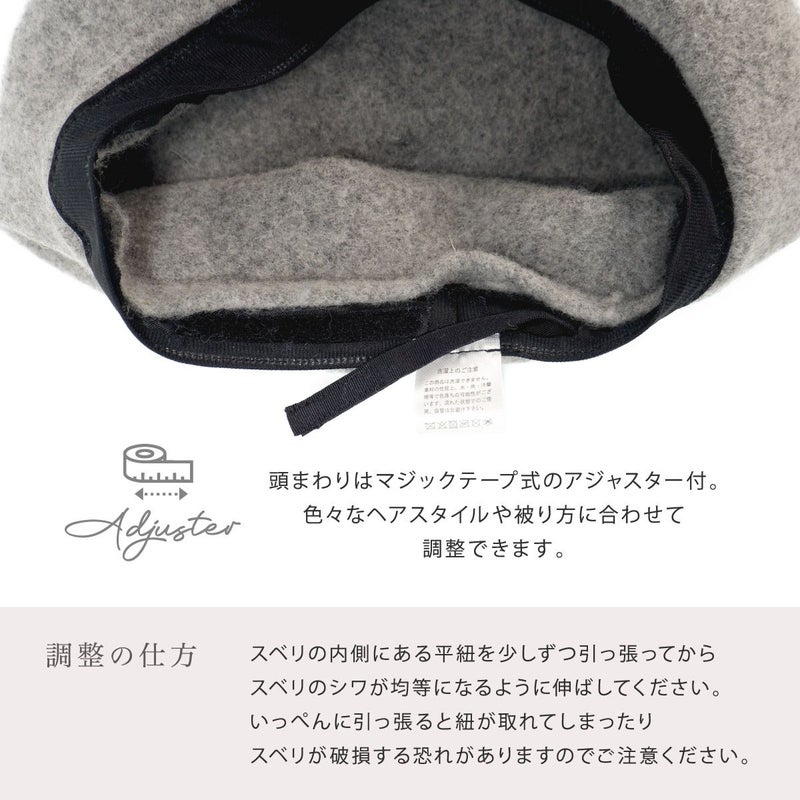 こちらのベレー帽は当店の定番アイテムより大きめサイズで、頭まわりは余裕のある58cmサイズ、さらにトップ部分にはボリュームをもたせ、フォルムアレンジがしやすいよう深さや厚みにもこだわりました。ベレー帽は大人が被りやすいおすすめのヘッドウェアで、髪型やお好みに合わせて色々なアレンジで楽しめます。頭まわりはマジックテープ式のアジャスター付、被り方に合わせて調整が可能です。フェルトの毛羽立ちを軽減するために、表面に撥水加工を施しました!