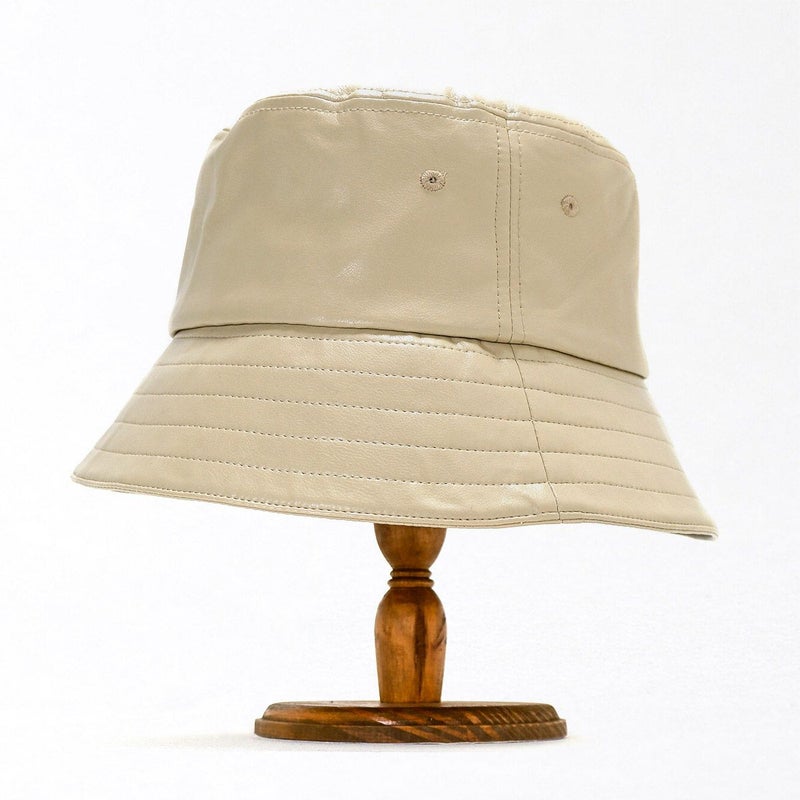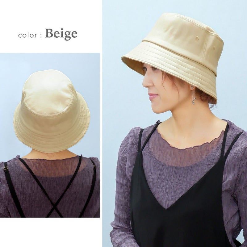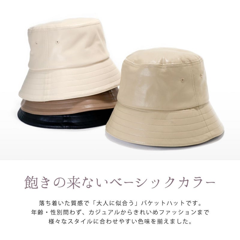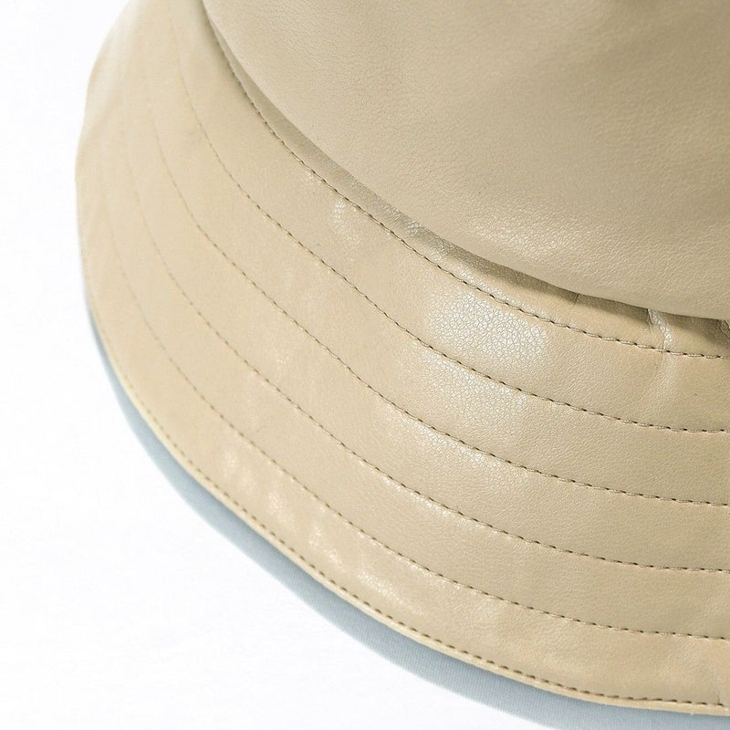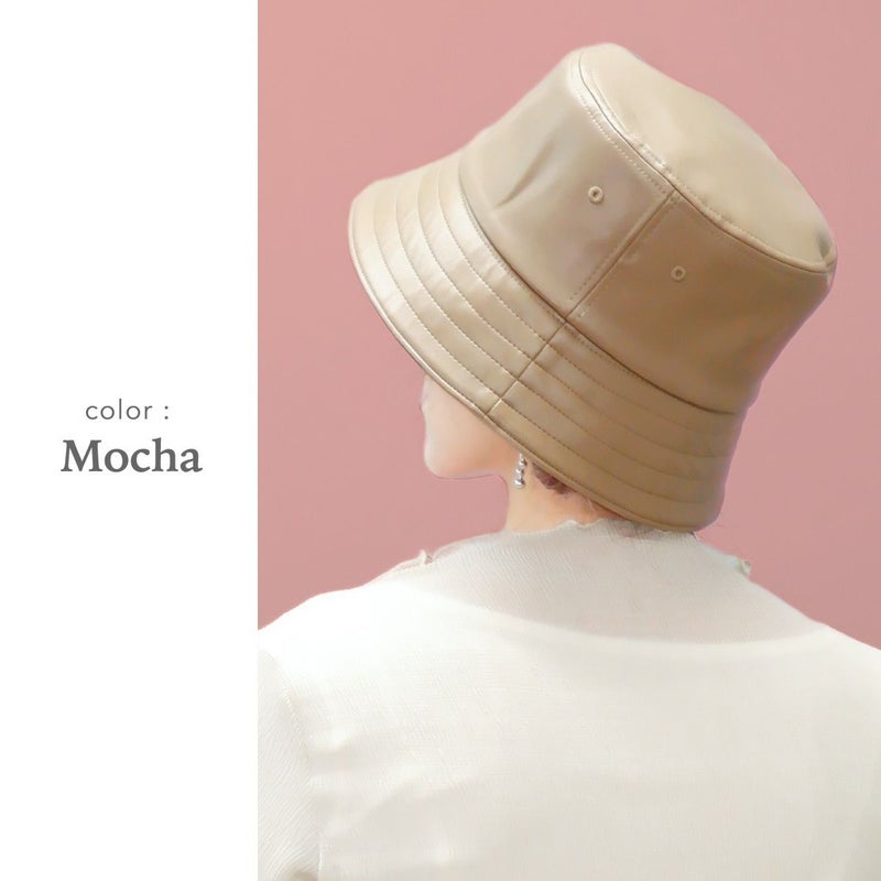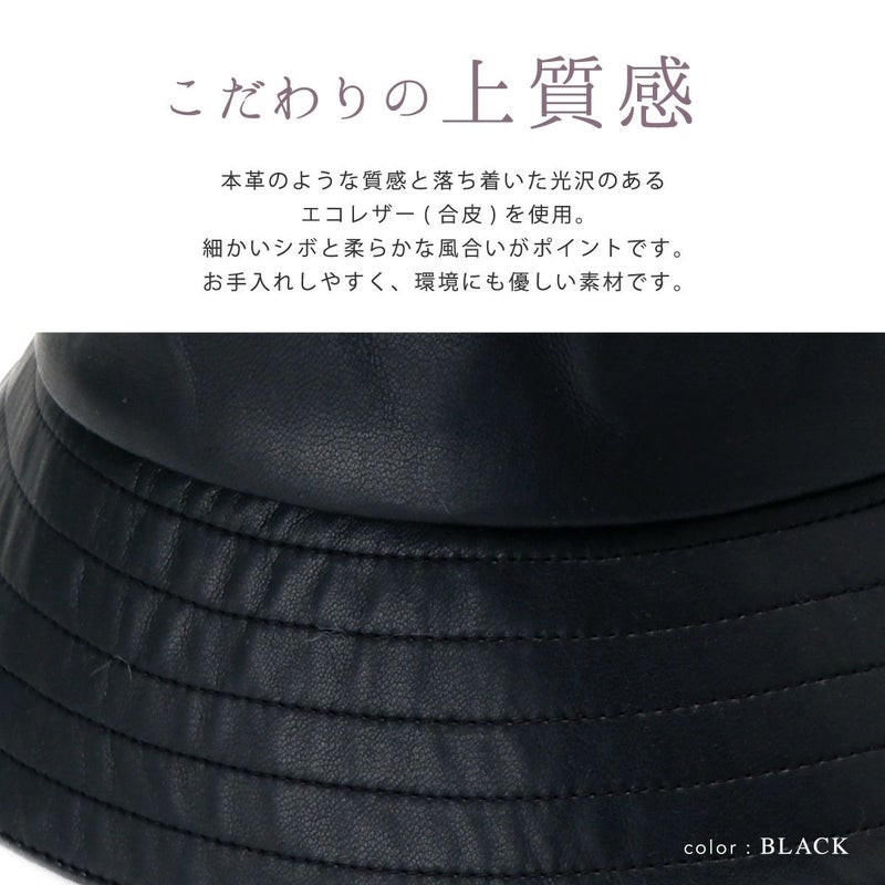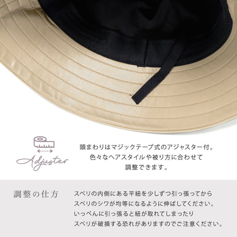 通常のバケットハットより深め+ダウンブリムにすることで、目元を紫外線からしっかり守れるUV対策と小顔効果も叶うバケハに仕上げました。シンプルなデザインなので、シーズンを通して気軽に被れるアイテムです。ちょっとした外出時のすっぴん隠しにも◎本体部分は本革のような質感と落ち着いた光沢のあるエコレザー(合皮)を使用、細かいシボと柔らかな風合いがポイントです。環境にも優しい素材でお手入れしやすく、年齢・性別問わず、カジュアルからきれいめファッションまで様々なスタイルに合わせやすい色味を揃えました。頭まわりはマジックテープ式のアジャスター付。色々なヘアスタイルや被り方に合わせて調整できます。落ち着いた質感で「大人に似合う」バケットハットです。