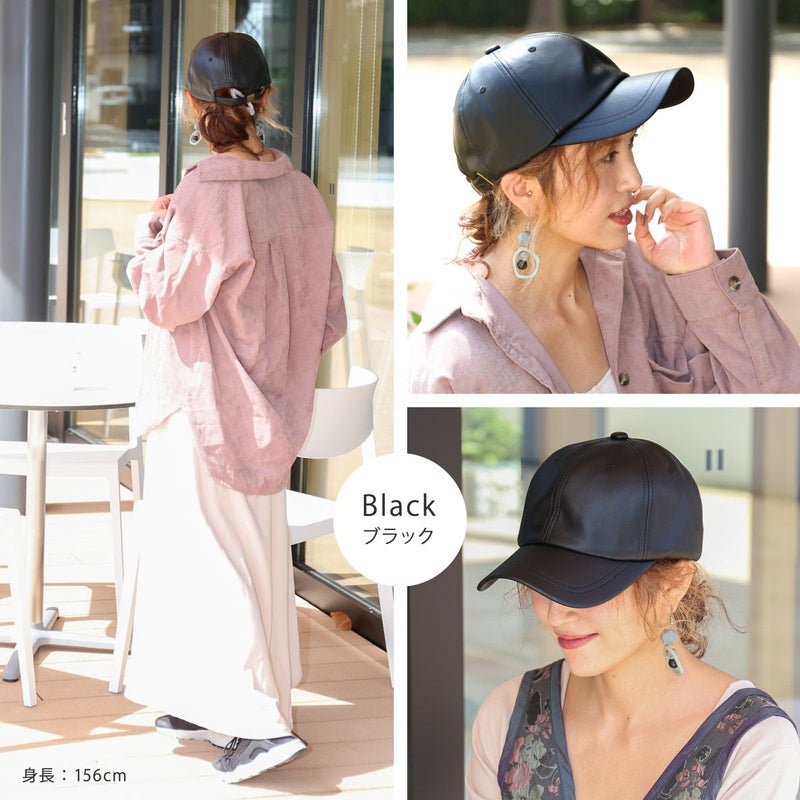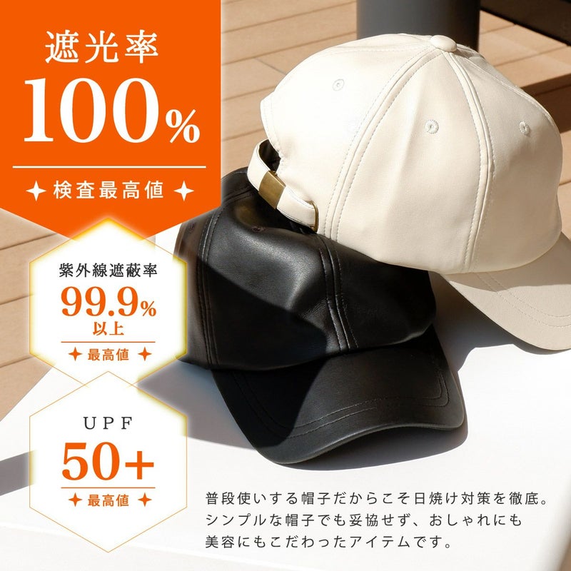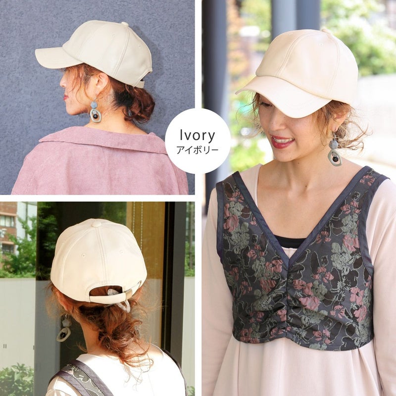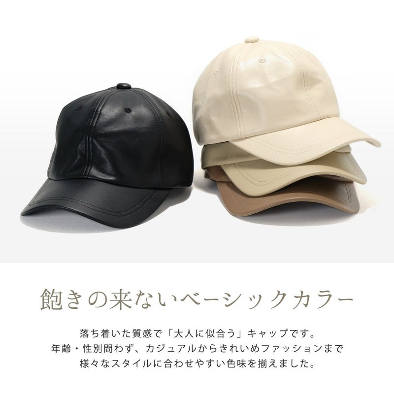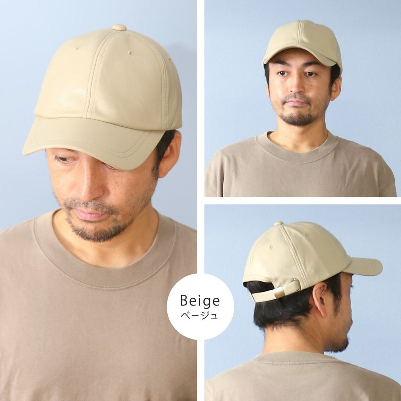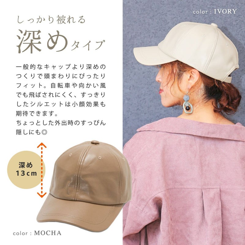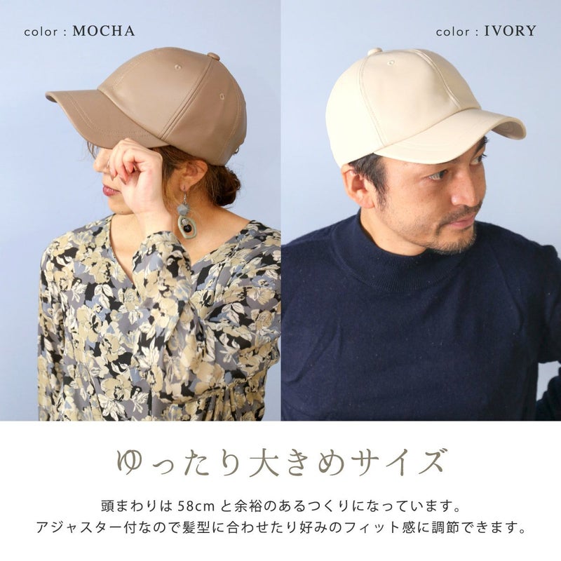 落ち着いた質感の「大人に似合う」キャップ。シンプルデザインだからこそ『機能性』と『素材感』にこだわり品のあるキャップに仕上げました。一般的なキャップより深めのつくりで頭まわりにぴったりフィット。自転車や向かい風でも飛ばされにくく、すっきりしたシルエットは小顔効果も期待できます。ちょっとした外出時のすっぴん隠しにも◎本体部分は本革のような質感と落ち着いた光沢のあるエコレザー(合皮)を使用。細かいシボと柔らかな風合いがポイントです。お手入れしやすく、環境にも優しい素材です。頭まわりは58cmと余裕のあるつくりになっています。アジャスター付なので髪型に合わせたり好みのフィット感に調節できます。後部のアジャスターにはアンティーク調の金具を施し、年齢・性別問わずお使いいただけます。普段使いする帽子だからこそ日焼け対策を徹底。シンプルな帽子でも妥協せず、おしゃれにも美容にもこだわったアイテムです。年齢・性別問わず、カジュアルからきれいめファッションまで様々なスタイルに合わせやすい色味を揃えました。