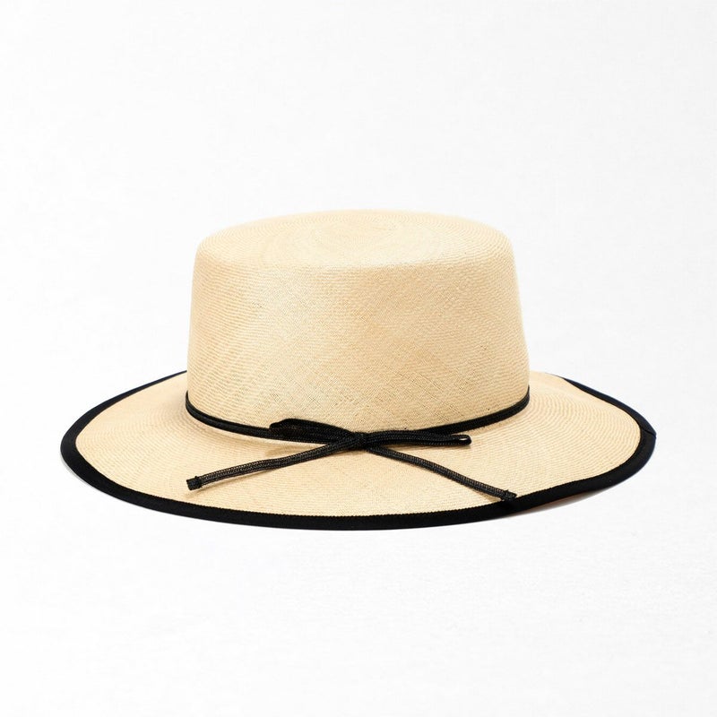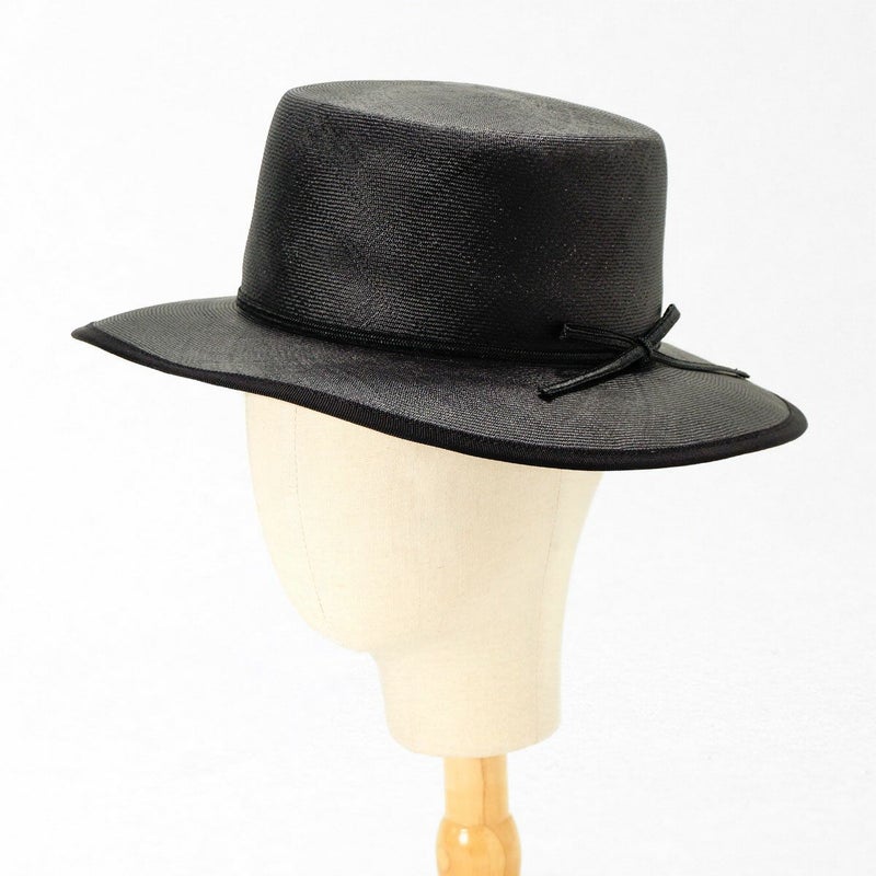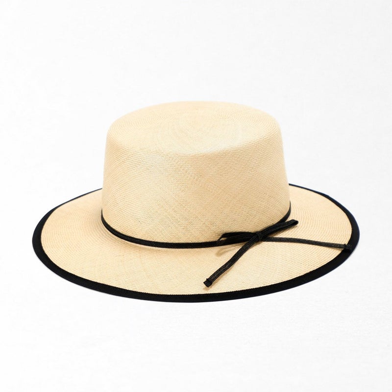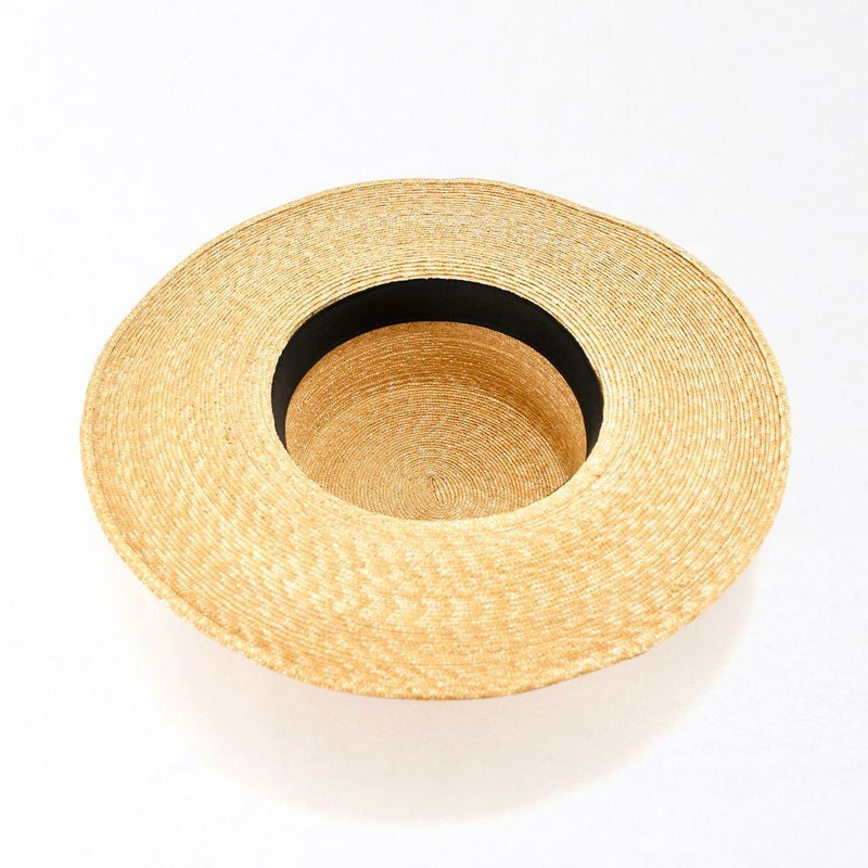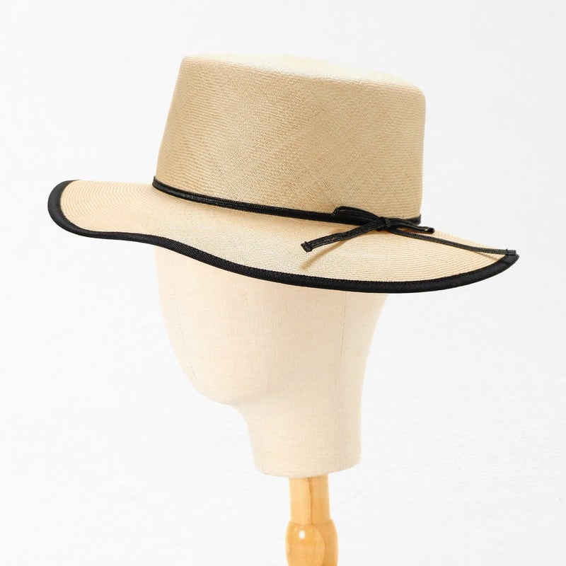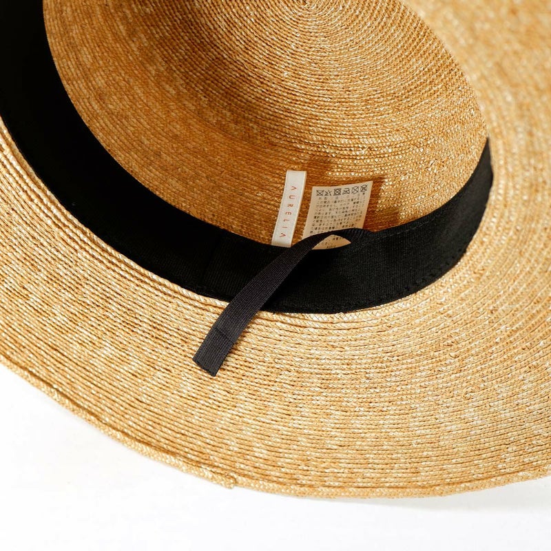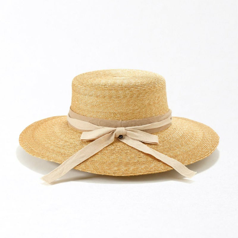 天然素材の艶が美しい細い麦わらブレードを、日本国内の工場でひとつひとつ職人が丁寧に縫い上げたカンカン帽。コシの部分にはコットンリボンが立体的に巻かれ、リボンの端は留めずに風にたなびくよう流してあります。さりげなく添えられたブランドロゴ入りチャームもポイントです。