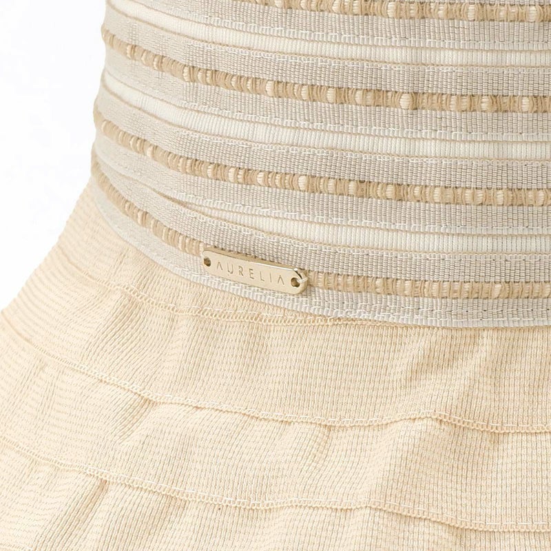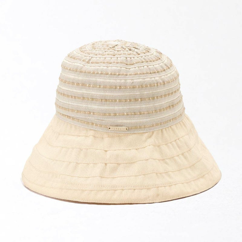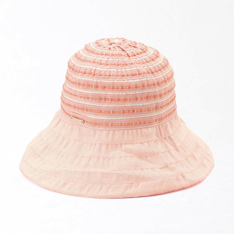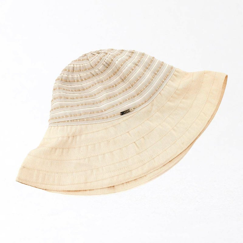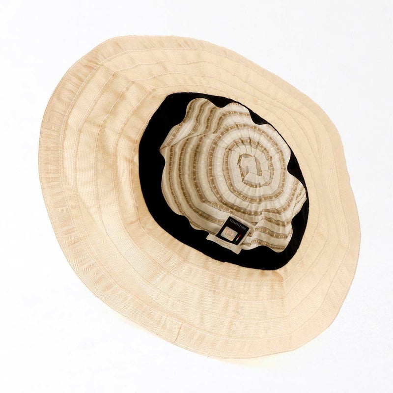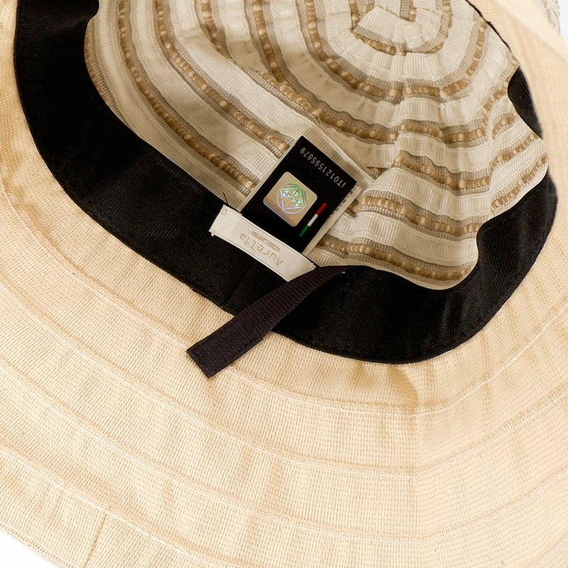 テープ状の生地をぐるぐると巻き上げて縫うブレード製法で作られたハット。民族模様を思わせる刺繍がほどこされた、シャリ感のある生地で出来ており、優雅な雰囲気に仕上がっています。素材にもイタリア製ならではのこだわりがあり、品質や色合いなど細かい選定を行い、デザインに合った素材選びがなされています。帽子内側のスベリ(ビン革)部分にアジャスターが付いているのでお好みのサイズ感で被れ、使わないときは折りたたんでコンパクトに持ち運べます。シンプルなデザインなのでカジュアルからエレガントまで幅広いスタイルに合わせられる帽子です。
