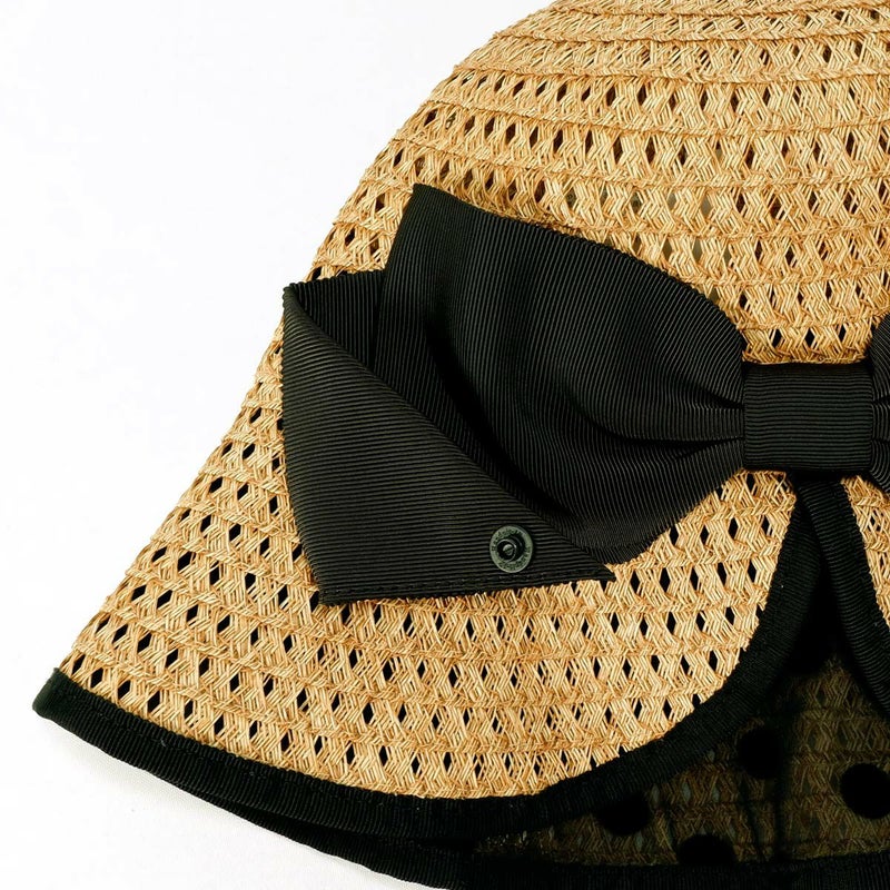 ドットレースヘムカットクロッシェは、透かし編みのブレードが涼しげな印象を与える夏の暑い日にぴったりなアイテム。つば裏に施されたドット柄のレースが、可愛らしいアクセントになっています。幅広のリボン飾りとヘムカット仕様のバックスタイルが、女性らしさを引き立てるポイント。小ぶりで使いやすいサイズ感のつばは、小顔効果も期待できます。折りたたんで持ち運びも便利なので、旅行やアウトドアシーンでも大活躍間違いなしです。スベリ(ビン革)部分には抗菌防臭・吸水速乾素材を使用しており、暑い日も汗を気にせず、快適に過ごせる嬉しい仕様です。