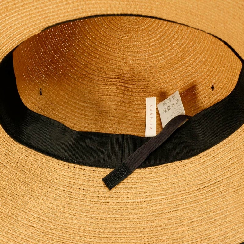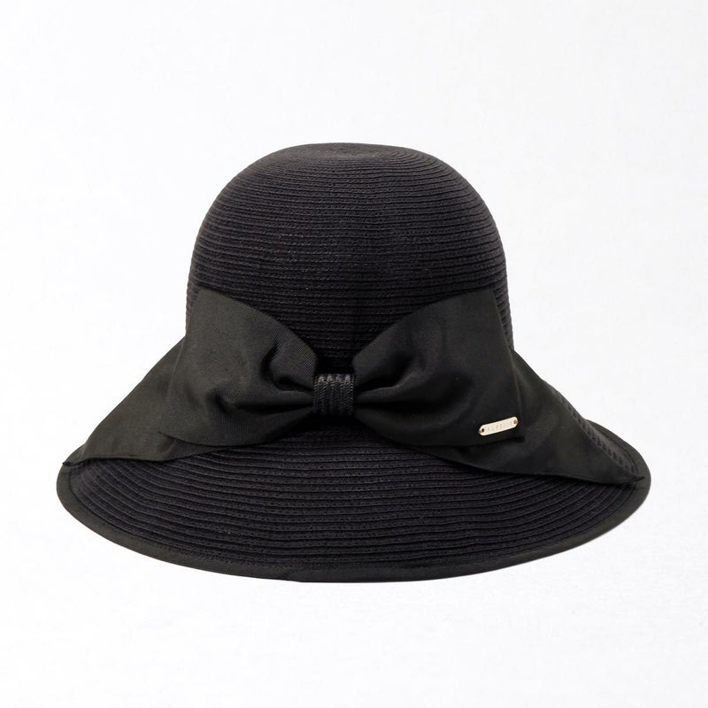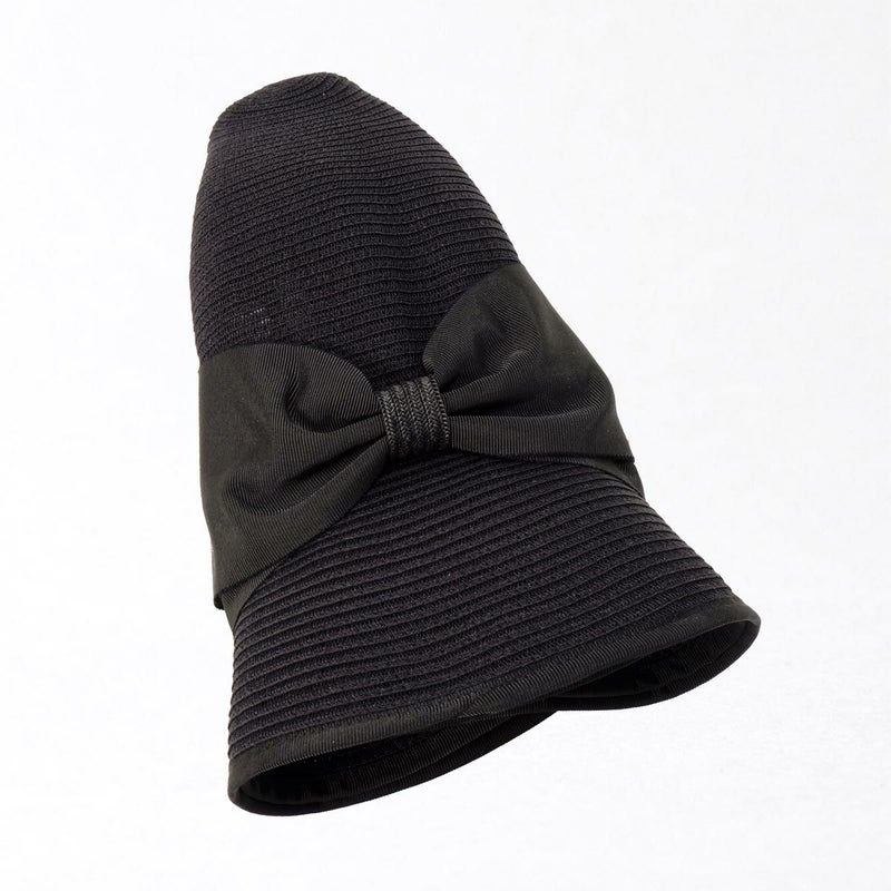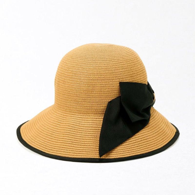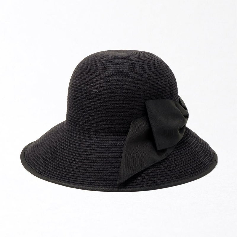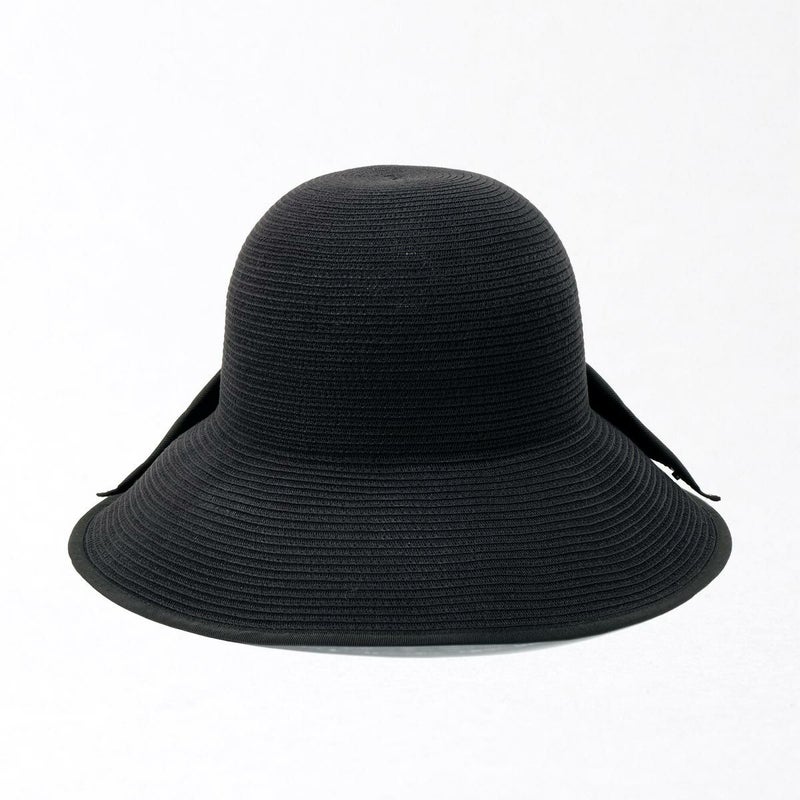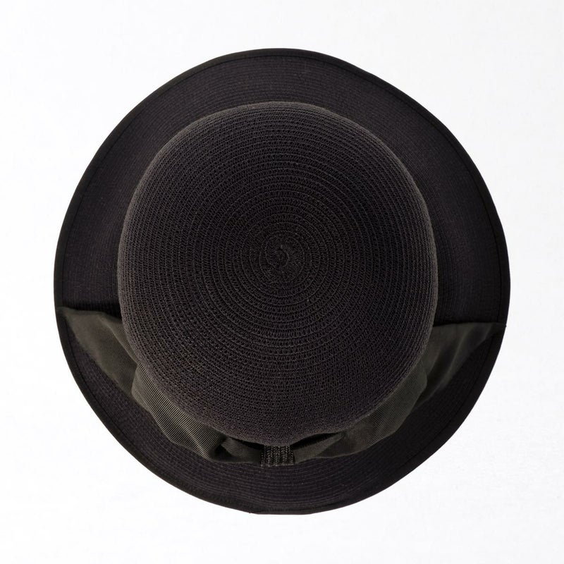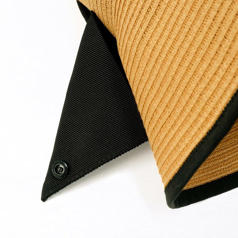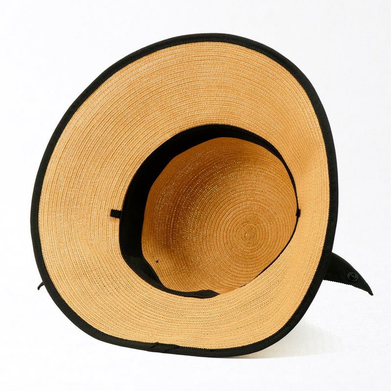 通気性の良いブレード素材を使用したつば広キャペリン。つば先にはパイピングが施されており、デザイン性と耐久性を兼ね備えています。手洗いが可能なので、いつでも清潔に保てます。さらに、折りたたみが可能で、リボン裏のボタンを留めることでコンパクトに収納でき、旅行や外出時にもバッグにすっきり収まります。