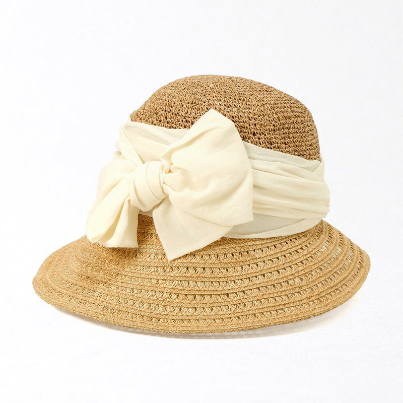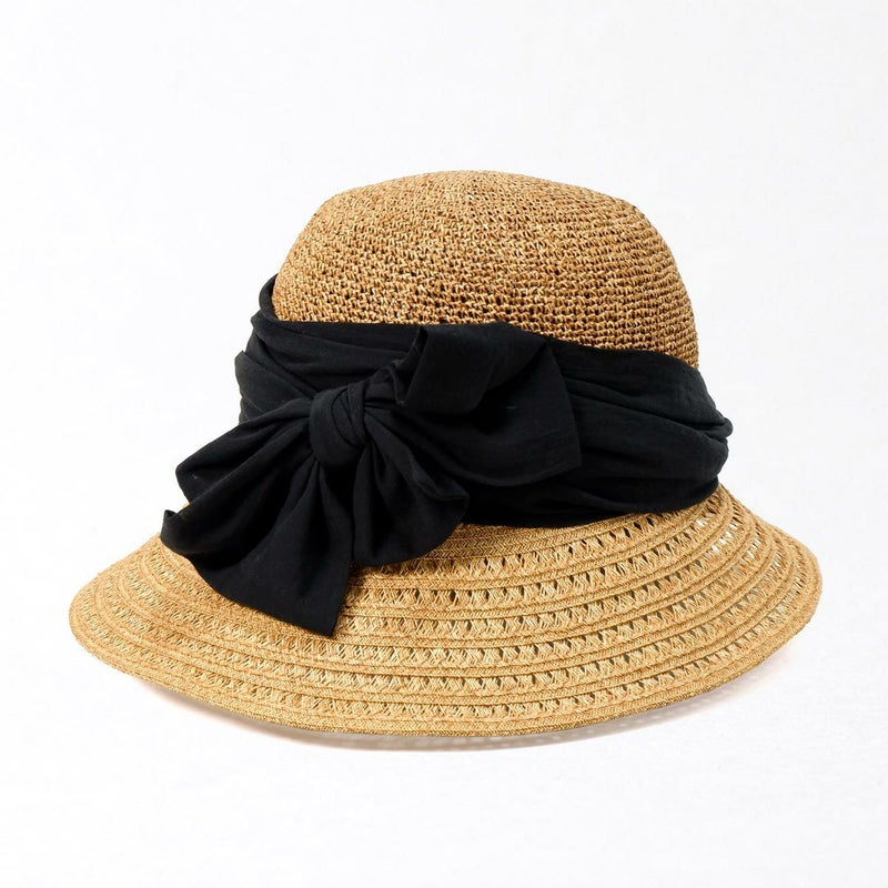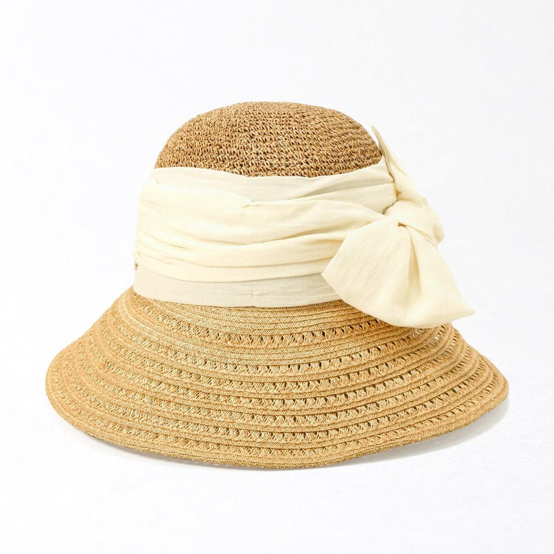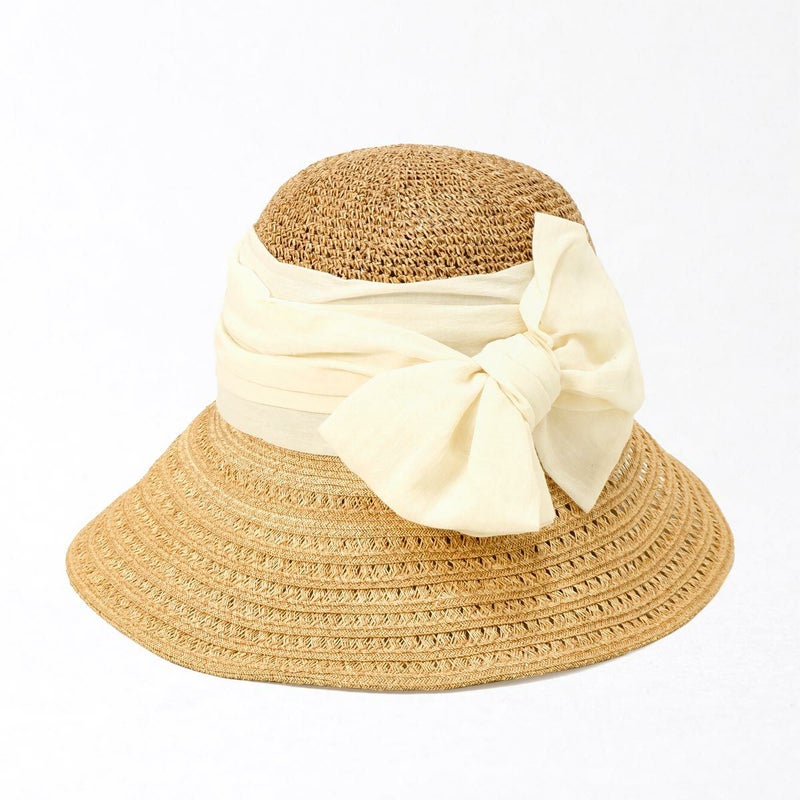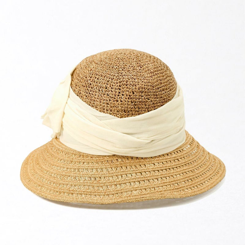 透かし編みブレードと細編みのコンビネーションが涼やかなつば広キャペリン。つば先に織り込まれたラメブレードが動きに合わせてさりげなく煌めきます。やや透け感のあるふんわり巻かれたコットンがナチュラルな雰囲気を醸します。スベリ(ビン革)部分には抗菌防臭・吸汗速乾素材を使用、暑い季節でも快適に被れます。前後のつばの長さを変えることで、前方は日除けに、短い後方は上を向いた場合でも背中などに干渉しない、ファッション性と実用性を兼ね備えたアイテムです。