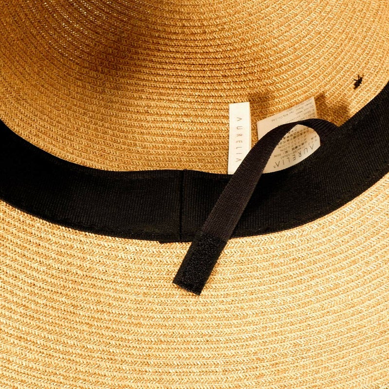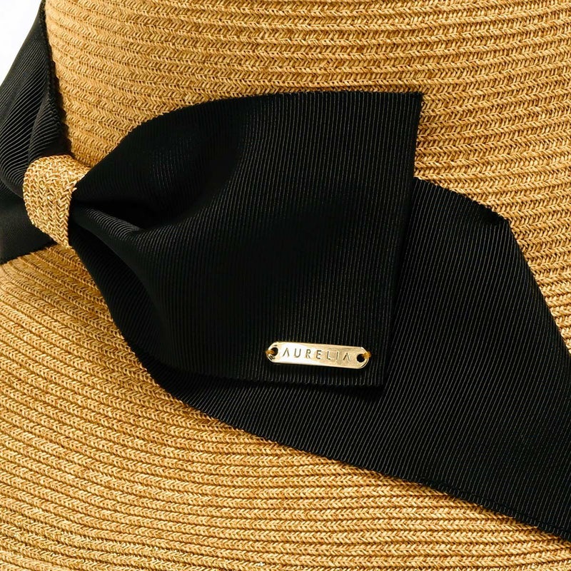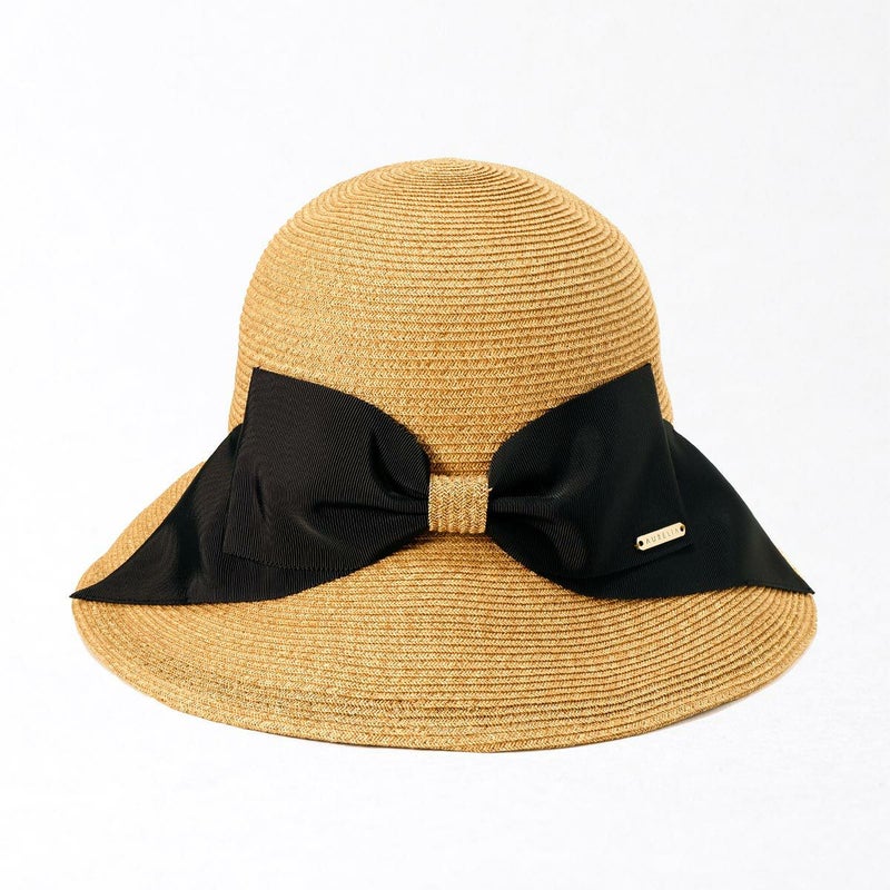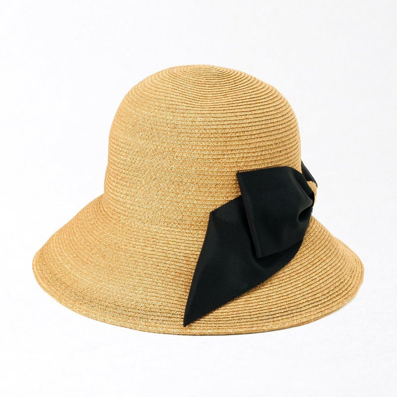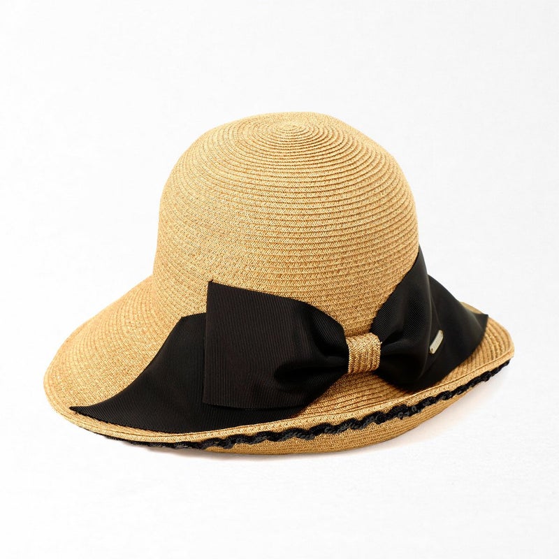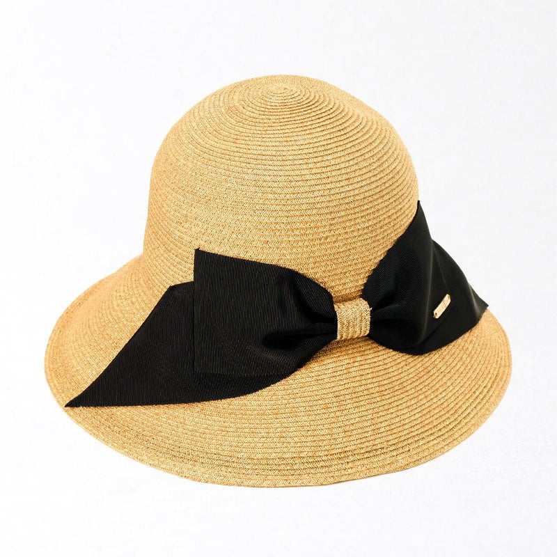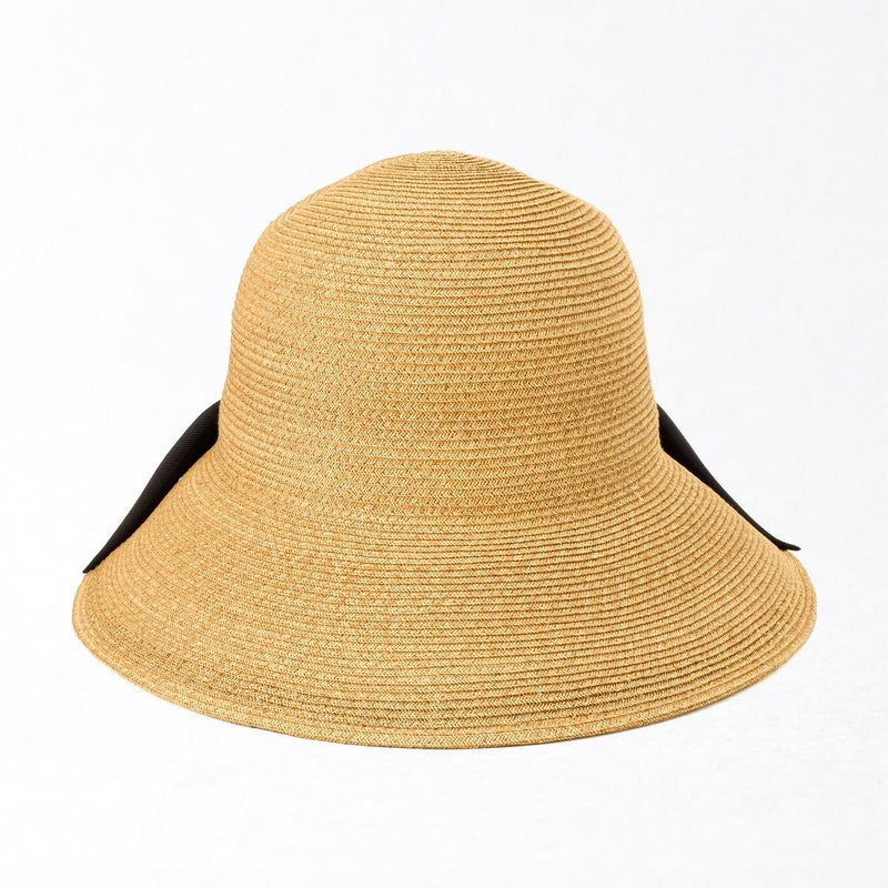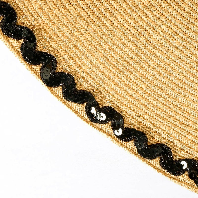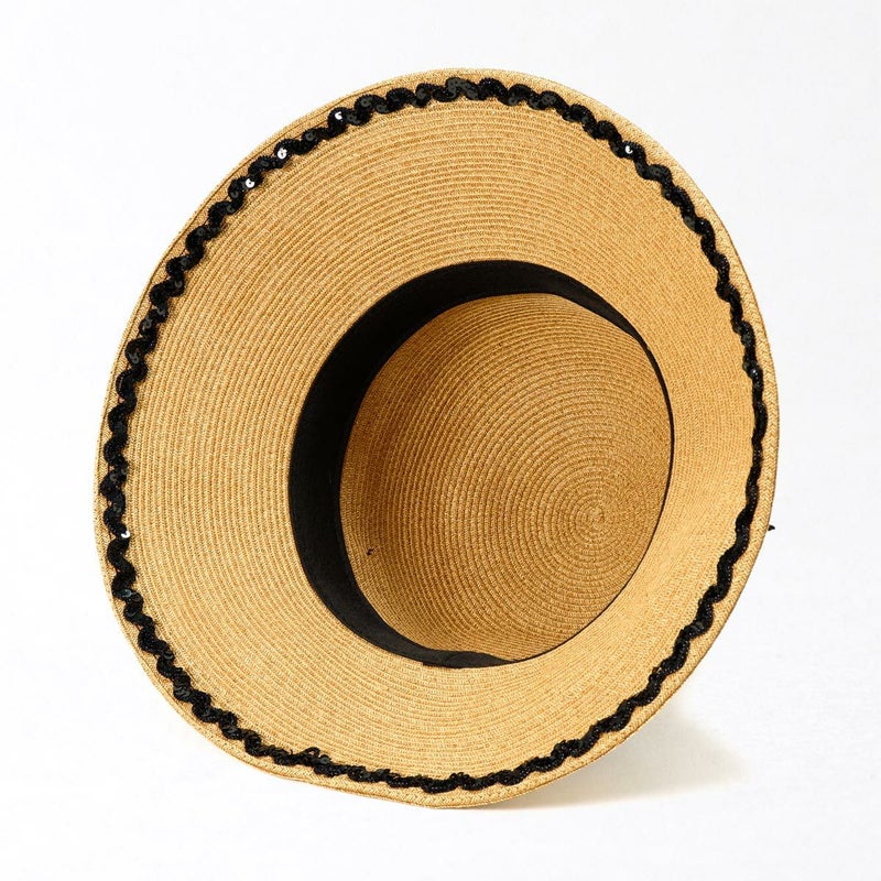 細く丈夫な色褪せが起こりにくい、耐久性のあるブレードを使用したリボンブレードハット。つばが長くしっかり日よけ出来て、ブリムアップにしても綺麗なシルエットで被って頂けます。つば(ブリム)の外側にはゴールドのラメブレードがさりげなく煌めきます。ブリムの内側には波状に配されたスパンコールが輝き、ブリムアップした際にまた一味違った印象を与える帽子です。