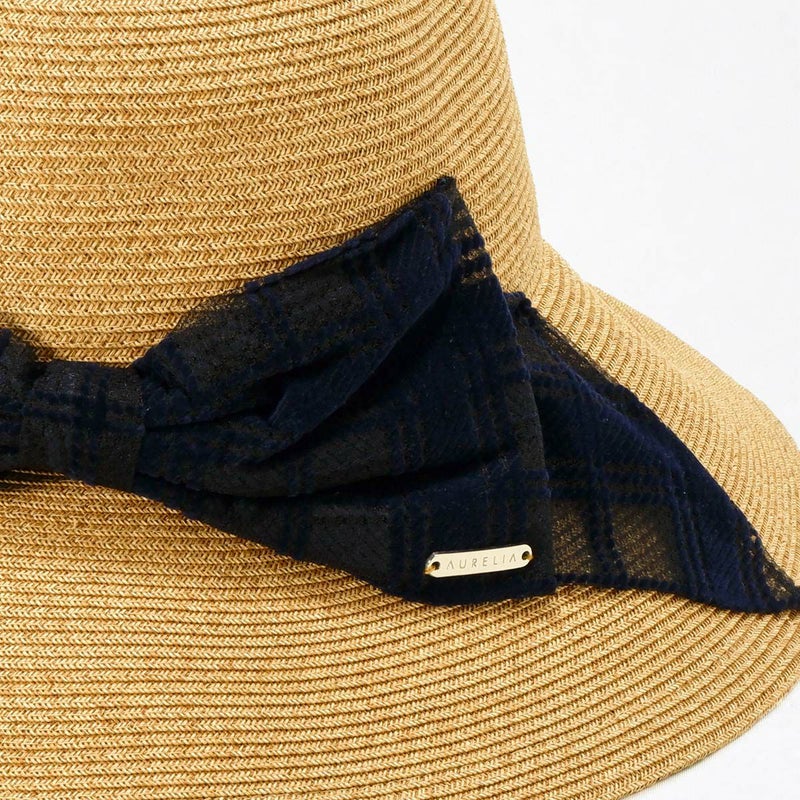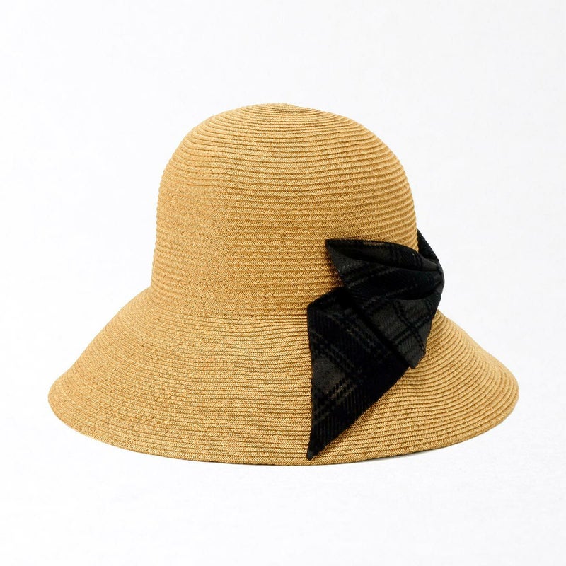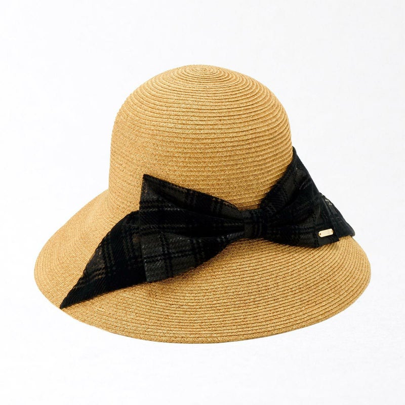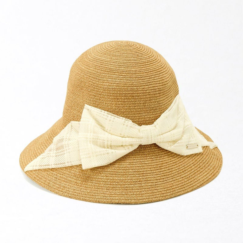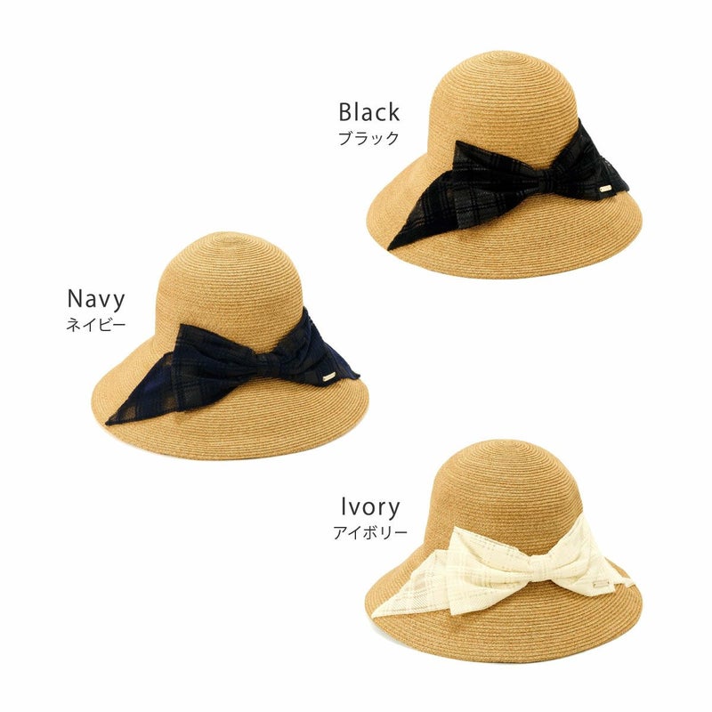 透け感のあるチェック柄リボンがおしゃれなキャペリン。ゴールドのロゴチャームがアクセントとなり、さりげないラグジュアリー感を演出します。約11cmのロングブリム(つば)がしっかりとした日除けとなり、紫外線遮蔽率97.7%以上と高いUVカット機能を備えています。スベリ(ビン革)の内側にはアジャスターが付いており、自分にぴったりのフィット感を得られます。リボンが女性らしさを引き立て、コーディネートのアクセントとしても活躍すること間違いなしのこの帽子は、チェック柄のリボンで一味違ったスタイルを楽しみたい方におすすめです。