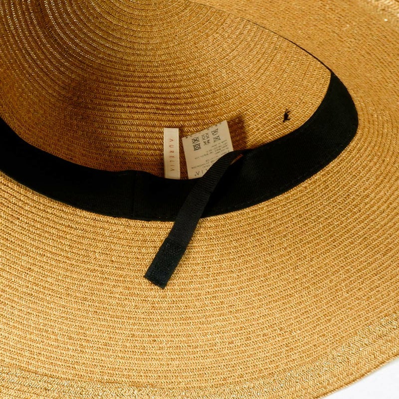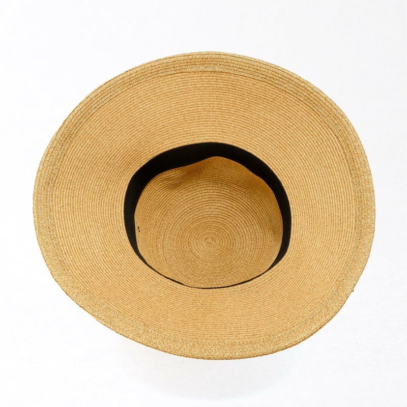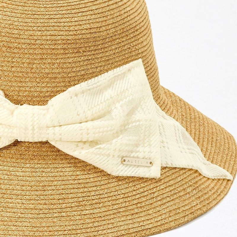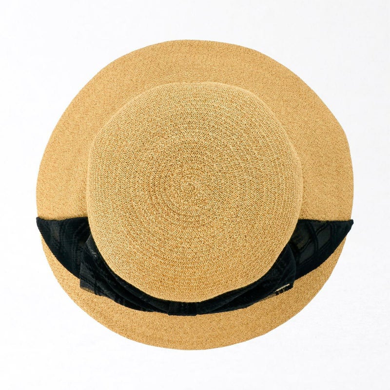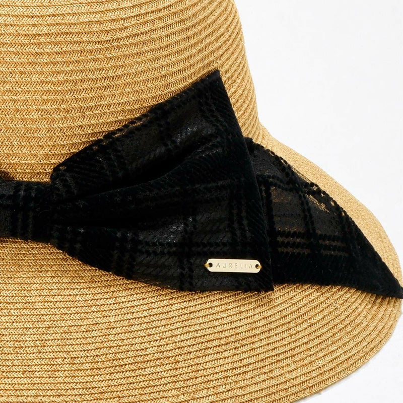 透け感のあるチェック柄リボンがおしゃれなキャペリン。ゴールドのロゴチャームがアクセントとなり、さりげないラグジュアリー感を演出します。約11cmのロングブリム(つば)がしっかりとした日除けとなり、紫外線遮蔽率97.7%以上と高いUVカット機能を備えています。スベリ(ビン革)の内側にはアジャスターが付いており、自分にぴったりのフィット感を得られます。リボンが女性らしさを引き立て、コーディネートのアクセントとしても活躍すること間違いなしのこの帽子は、チェック柄のリボンで一味違ったスタイルを楽しみたい方におすすめです。