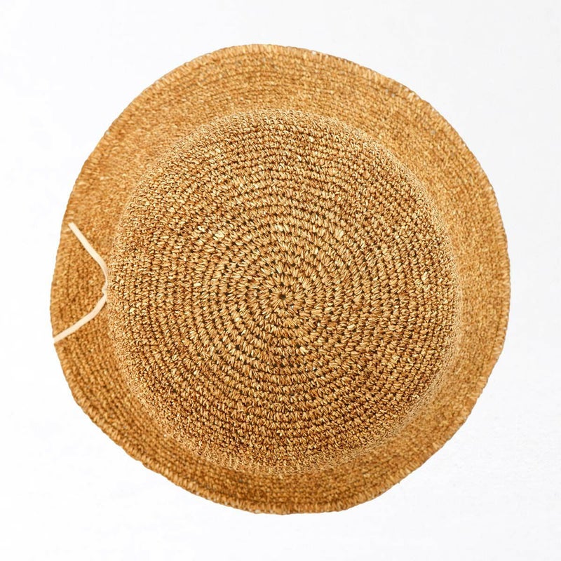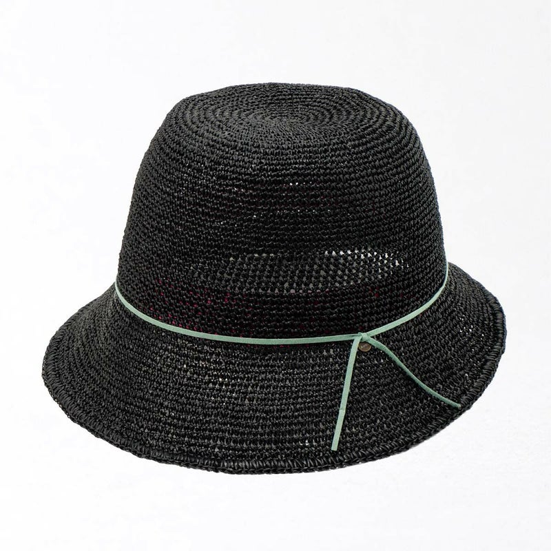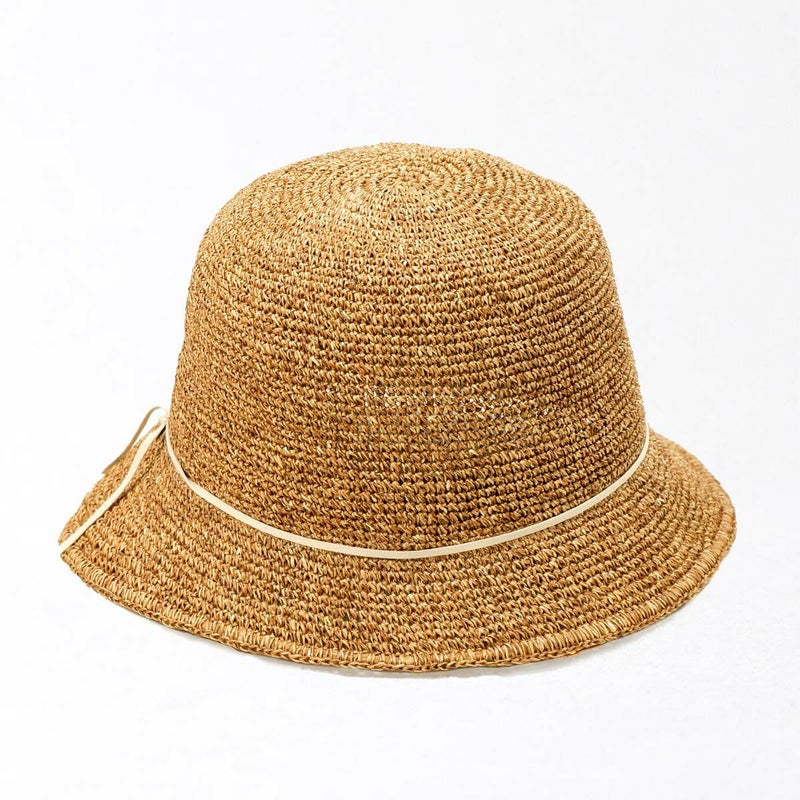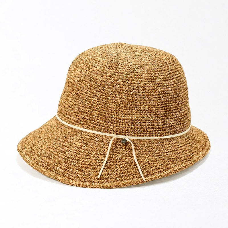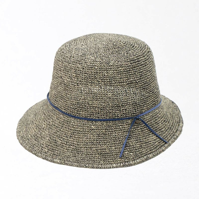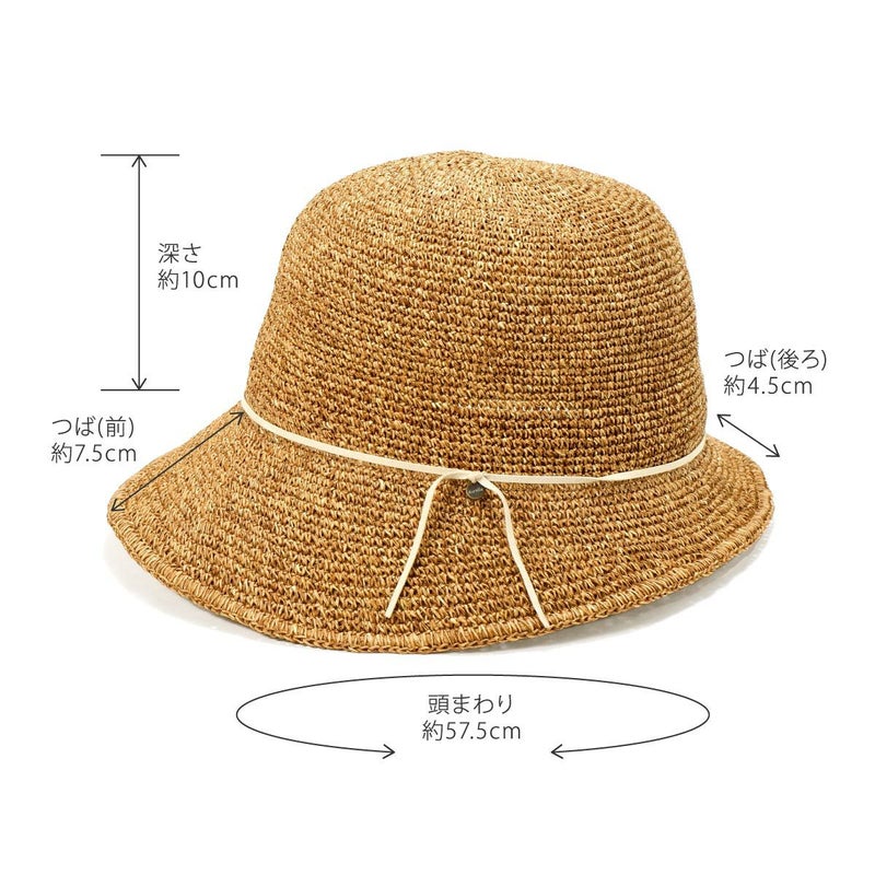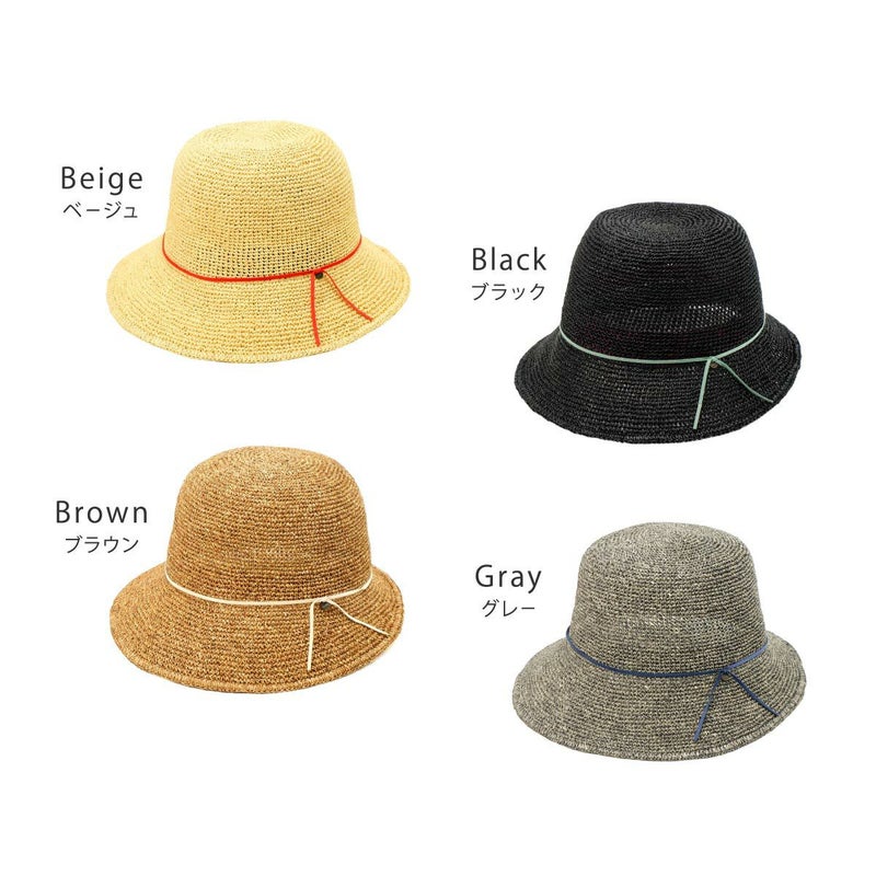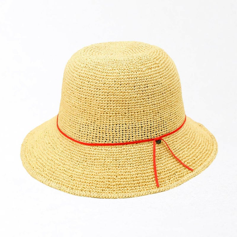 通気性の良い細編みのクロッシェ。ペーパー素材製で軽量な帽子で、折りたたんでカバンに収納できるのも嬉しいポイント。飾りはシンプルなスエード調のコードにブランドロゴのチャームが添えられています。パイル地のスベリは吸水性もよく、脱いだ時に帽子本体との配色も楽しめるアイテムです。