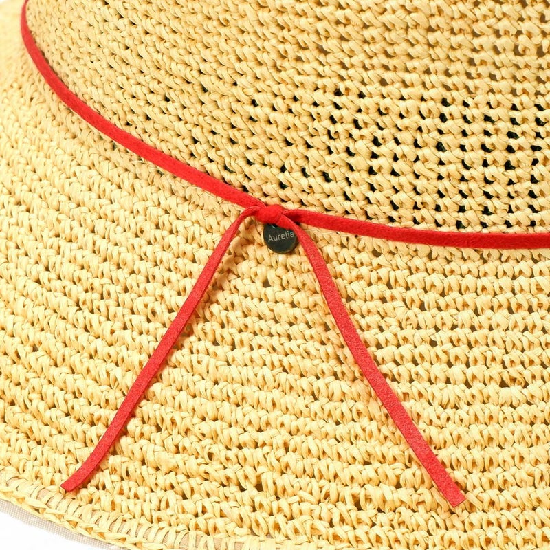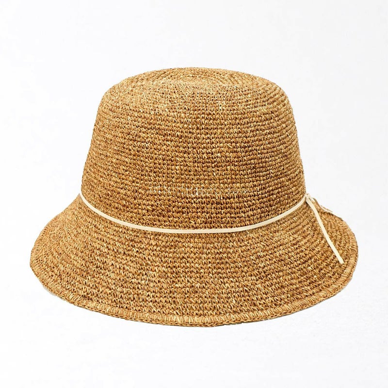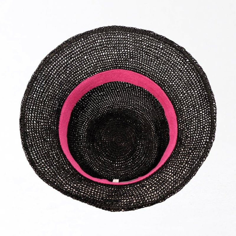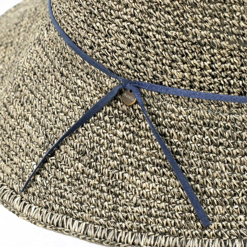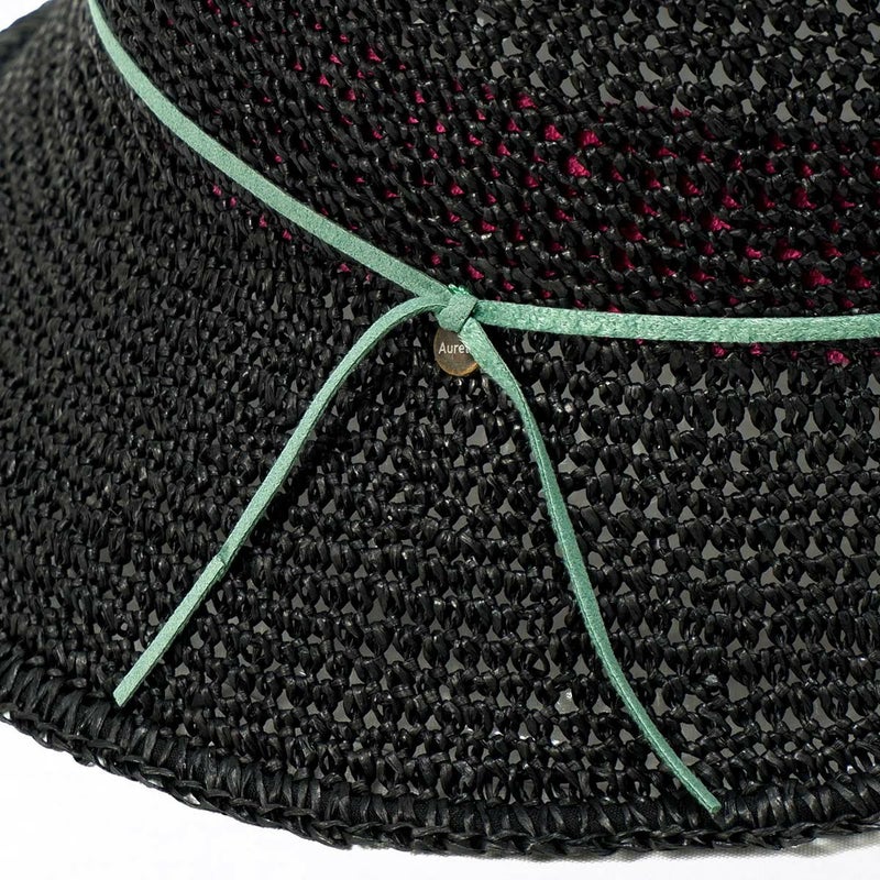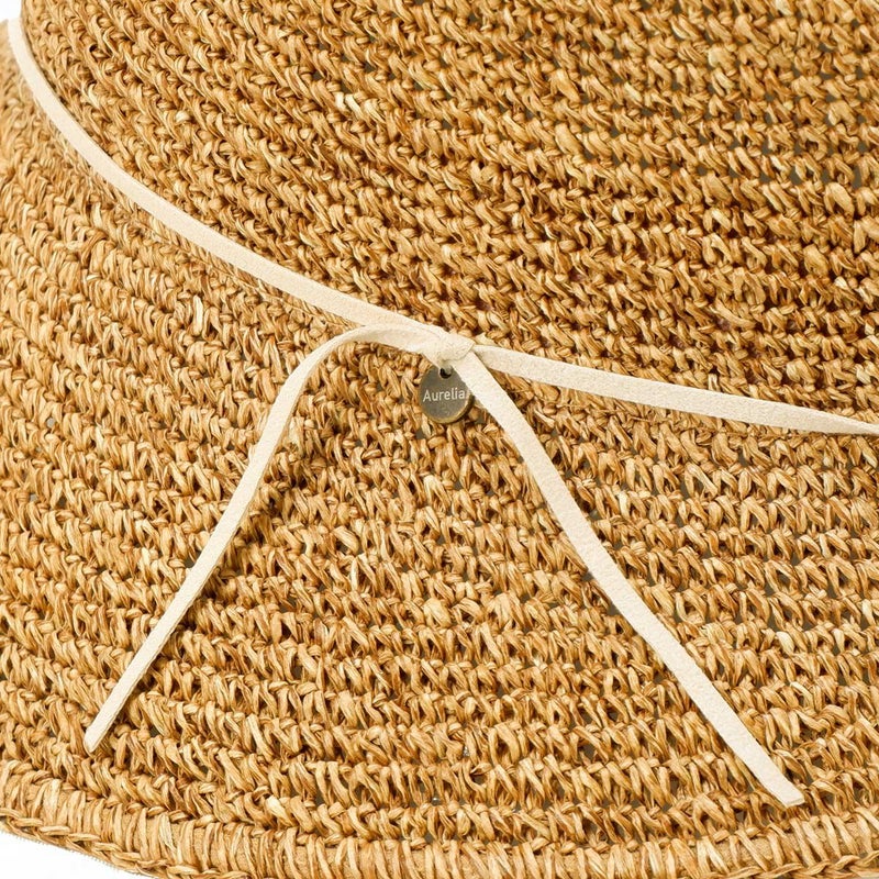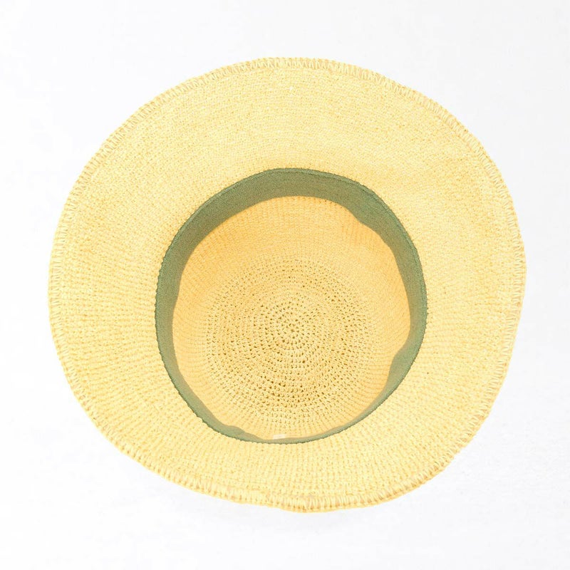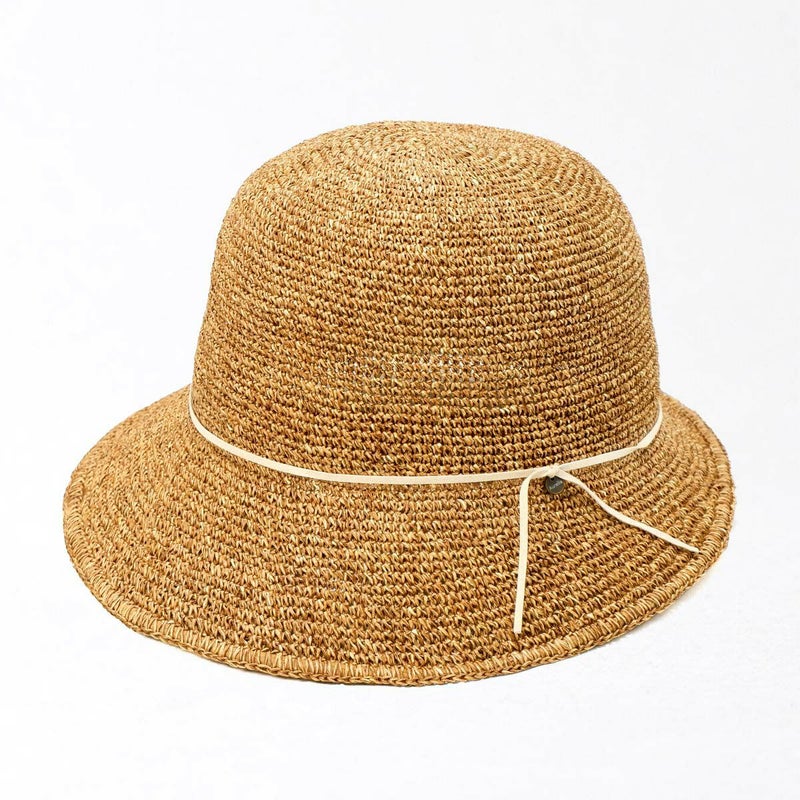 通気性の良い細編みのクロッシェ。ペーパー素材製で軽量な帽子で、折りたたんでカバンに収納できるのも嬉しいポイント。飾りはシンプルなスエード調のコードにブランドロゴのチャームが添えられています。パイル地のスベリは吸水性もよく、脱いだ時に帽子本体との配色も楽しめるアイテムです。