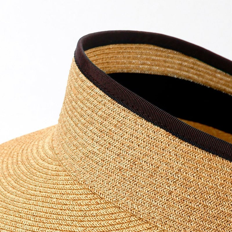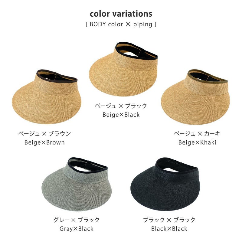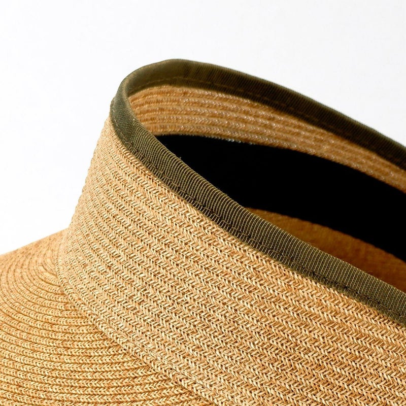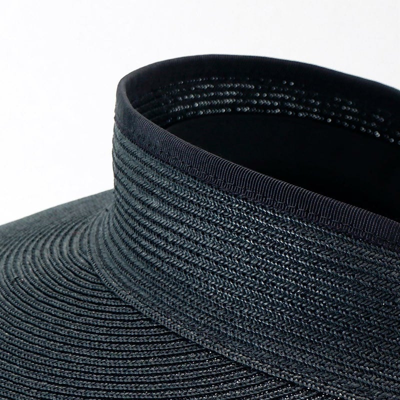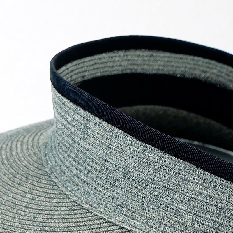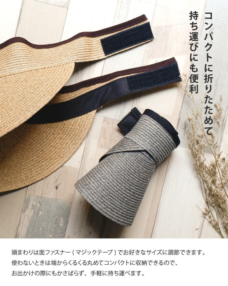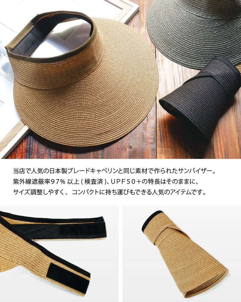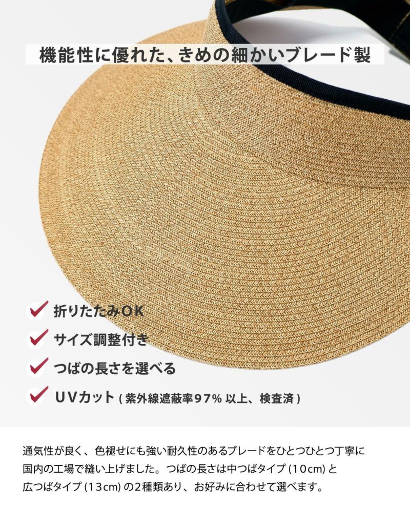 当店で人気の日本製ブレードキャペリンと同じ素材で、髪型を崩さず使えるサンバイザー。紫外線遮蔽率97%以上(検査済)、つばの長さは2種類、しっかり日除けができる13cmブリムの広つばタイプと、普段使いに最適なサイズの10cmブリムの中つばタイプをご用意しました。頭まわりは面ファスナー(マジックテープ)でお好きなサイズに調節できます。使わないときは端からくるくる丸めてコンパクトに収納できるので、お出かけの際にも手軽に持ち運べます。