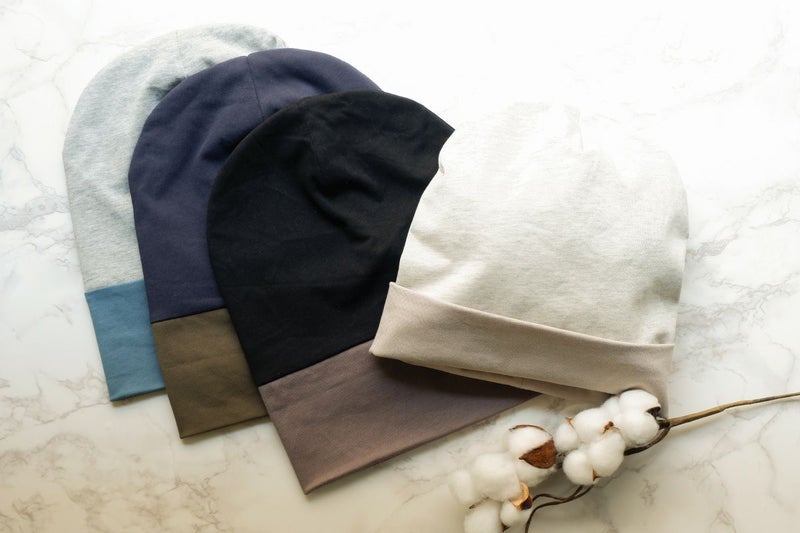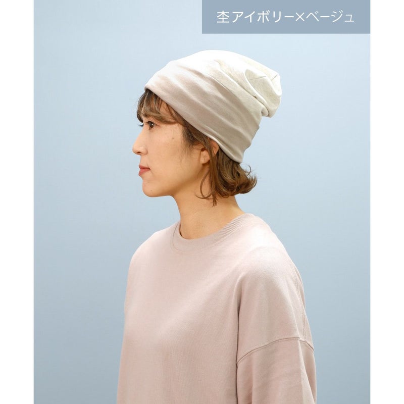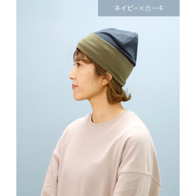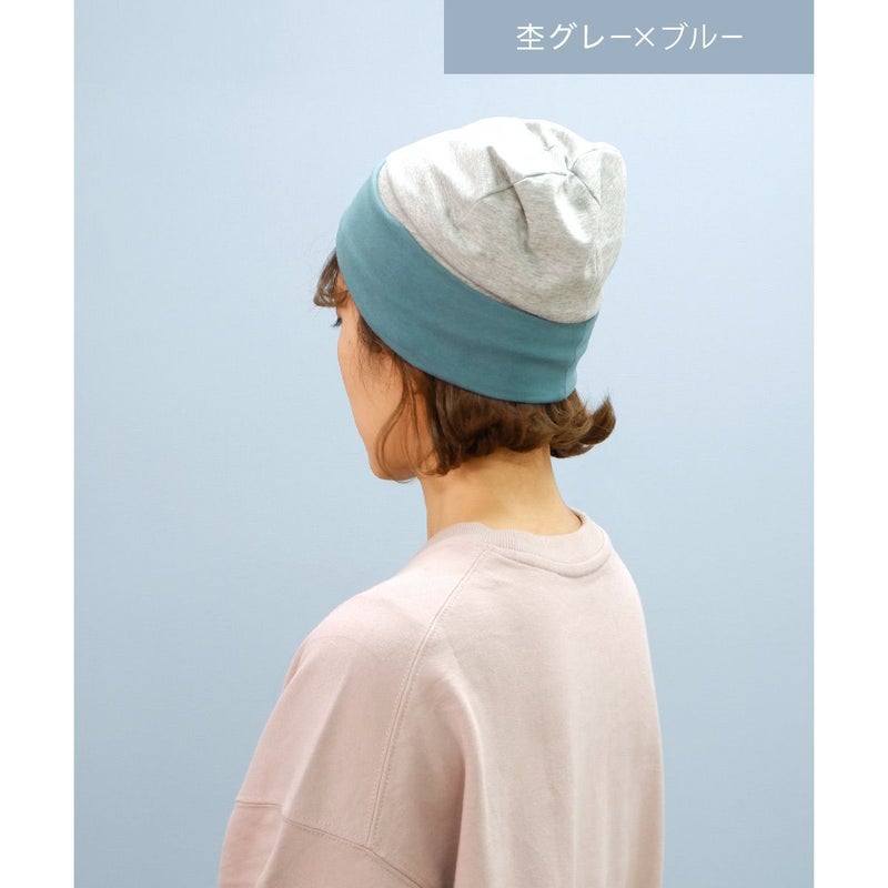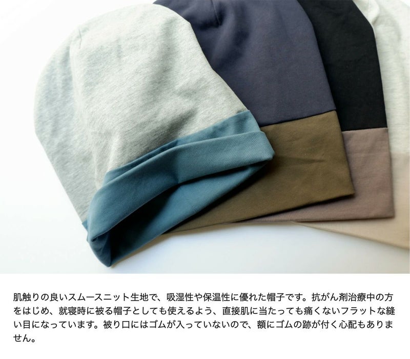 綿100%で肌にやさしい、抗がん剤副作用・脱毛・治療後ケア用スムースニットのリバーシブルワッチ。バイカラーの組み合わせがおしゃれで、一見医療用には見えないのでお出かけ用としても使えるのがポイントです。生地は二重になっているので透ける心配もなく、被り口を折り返してアレンジすることもできます。綿100%でオールシーズンOK、汚れや臭いが気になったらご家庭で洗濯できます。