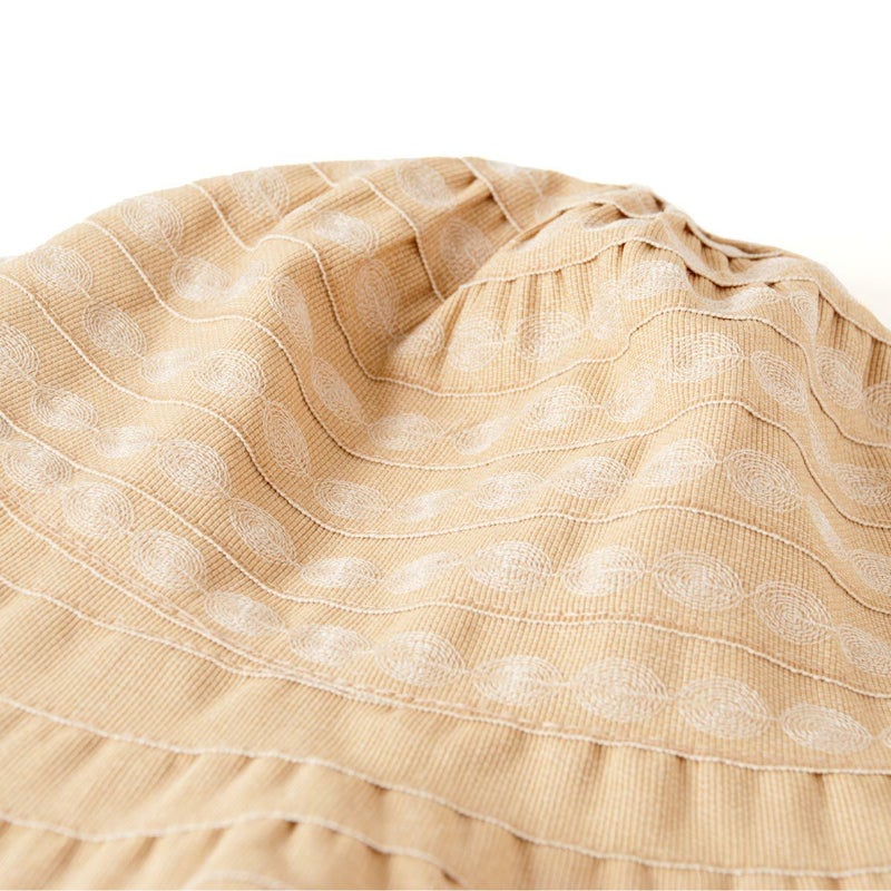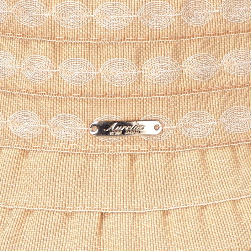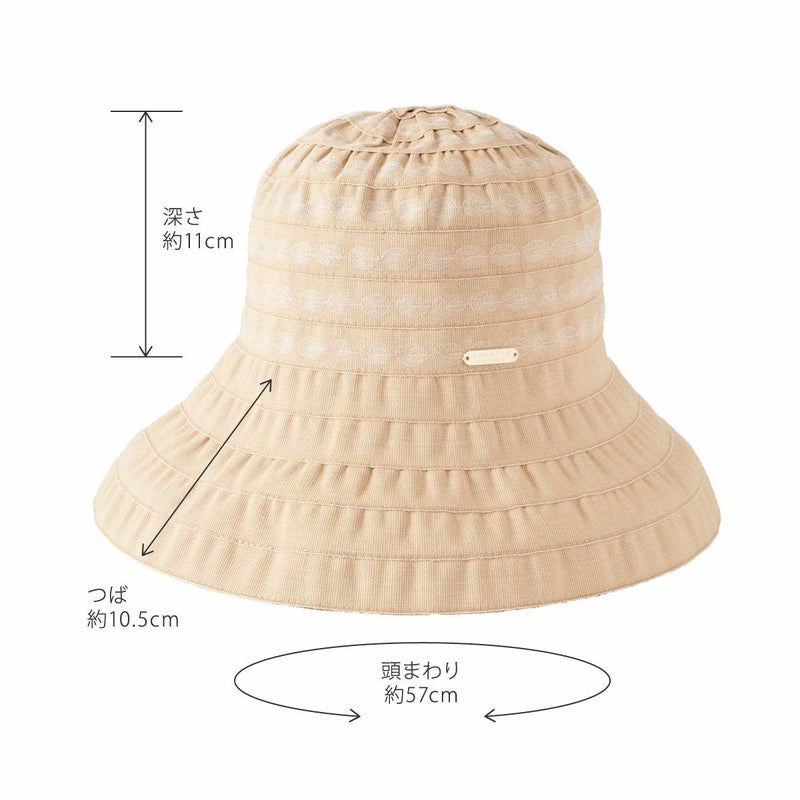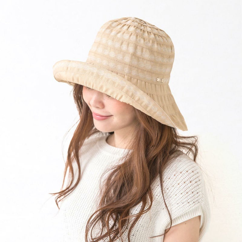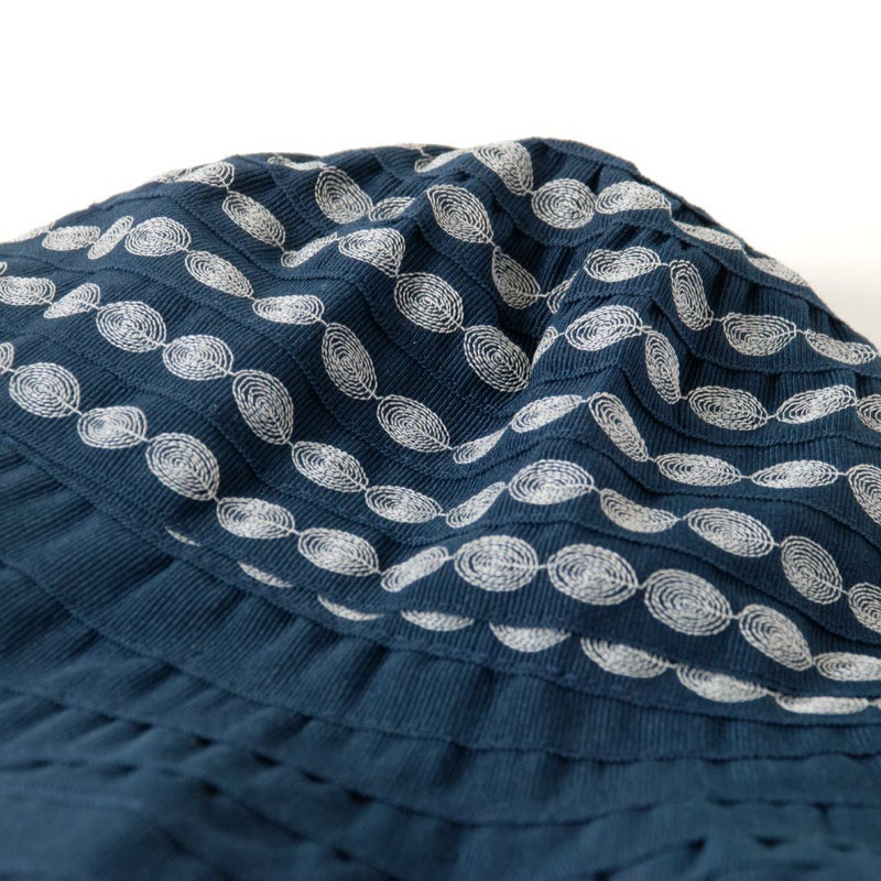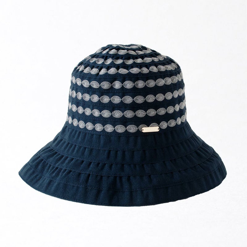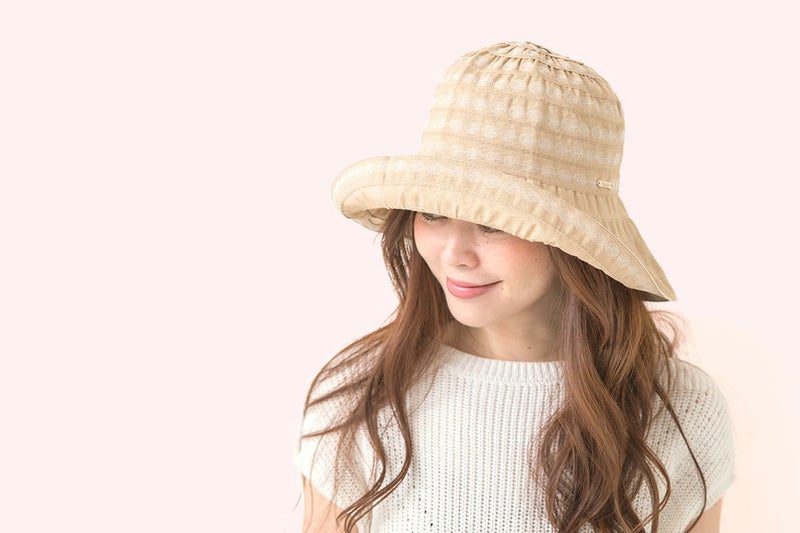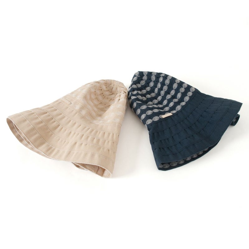 テープ状の生地をぐるぐると巻き上げて作るブレード製法で作られています。この製法では光が当たると独特の光沢感がうまれ、エレガントで上品な雰囲気になります。デザインがシンプルでいろいろなお洋服に合わせやすいという利点もあります。カラーは明るいベージュと引き締まったネイビーの2色展開。ベージュはやさしく明るい印象で、ネイビーは被るとお顔が引き締まった印象になります。