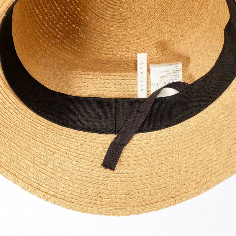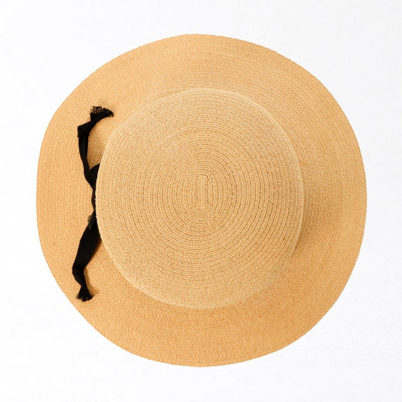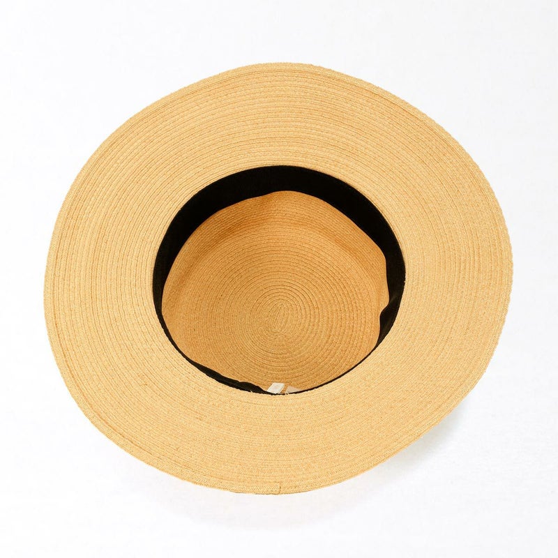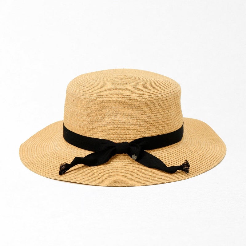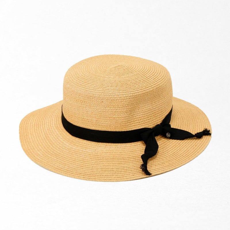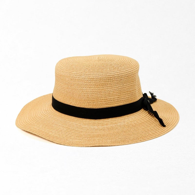 通気性の良いブレード素材でできたシンプルなカンカン帽。コシにはコットンのリボンをシンプルに飾りつけ、小ぶりなロゴチャームをさりげなく添えています。柔らかいブレード素材製で被るとつば先が自然と波打ちます。スベリ(ビン革)部分には抗菌防臭・吸汗速乾素材を使用、いつでも快適に被れます。