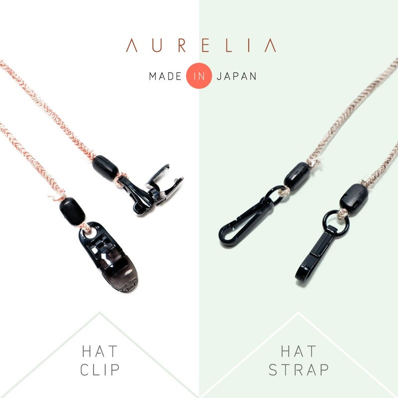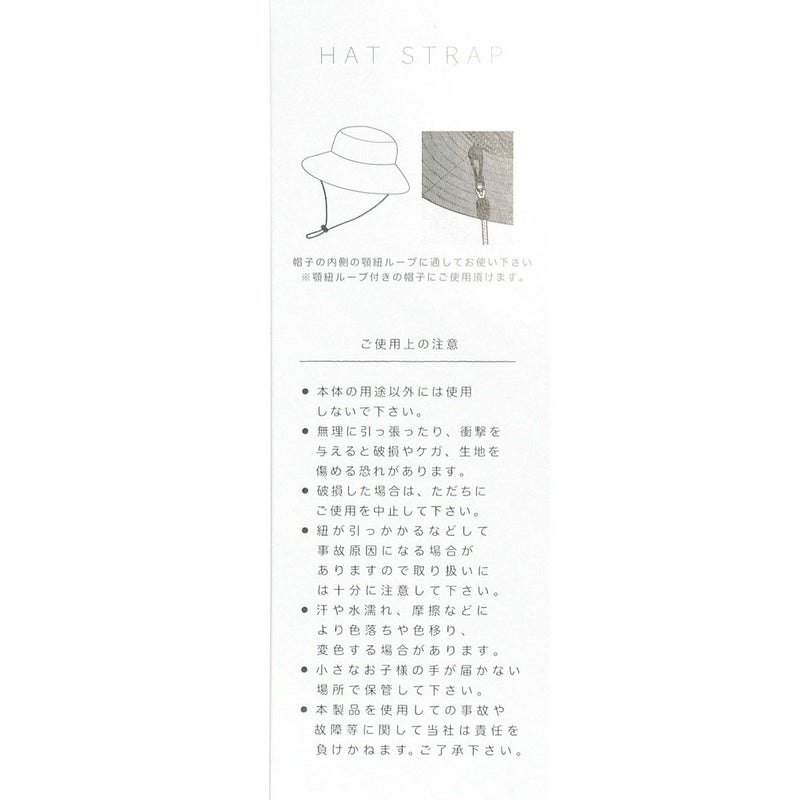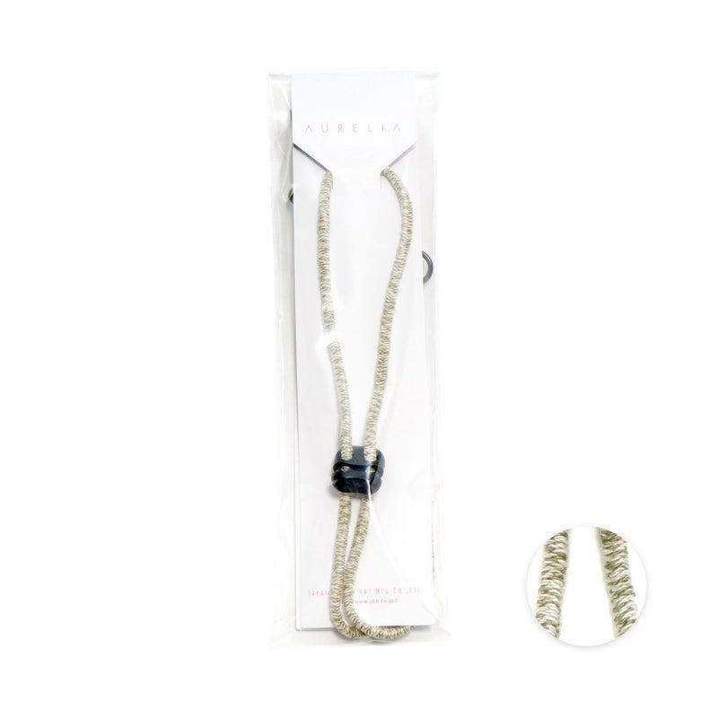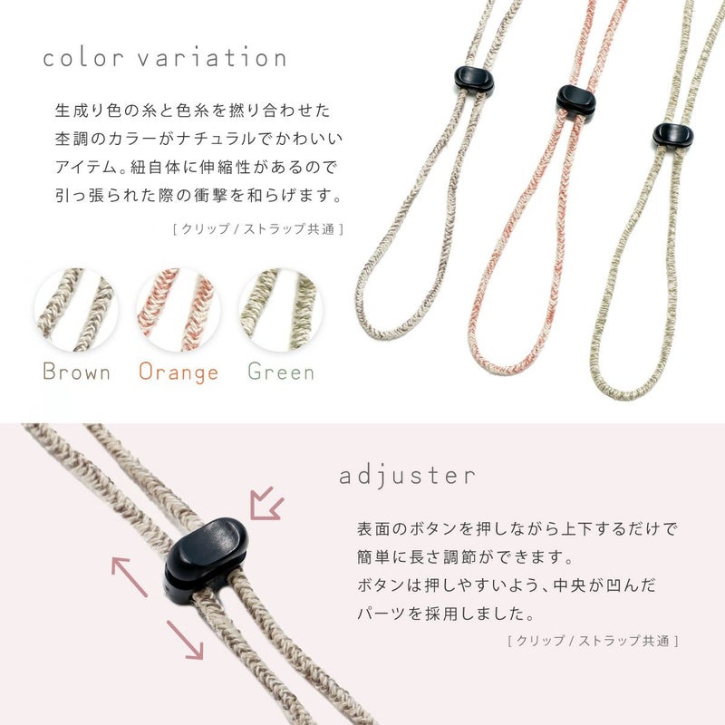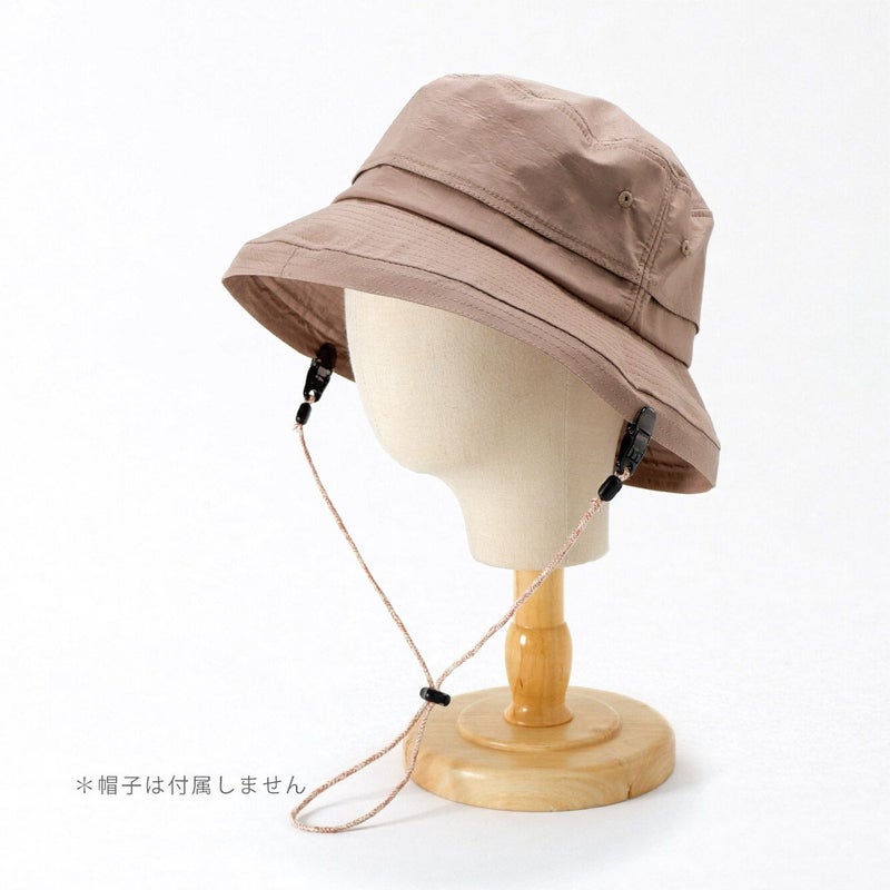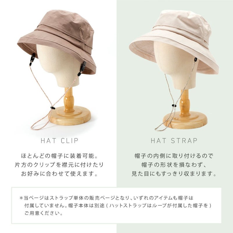 カラー×生成りのミックスカラーがかわいい日本製のハットクリップ/ストラップ。帽子が風で飛ばされるのを防ぎます。風の強い日はもちろん、自転車に乗る際にもひとつあると便利です。帽子の他にもマスクストラップとしてもご利用いただけます。