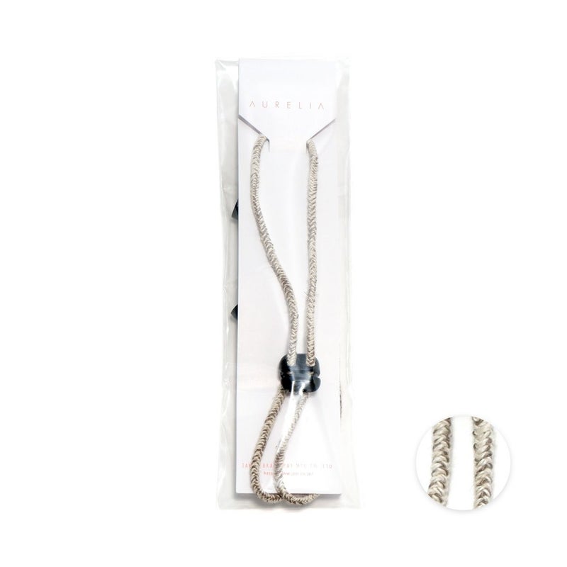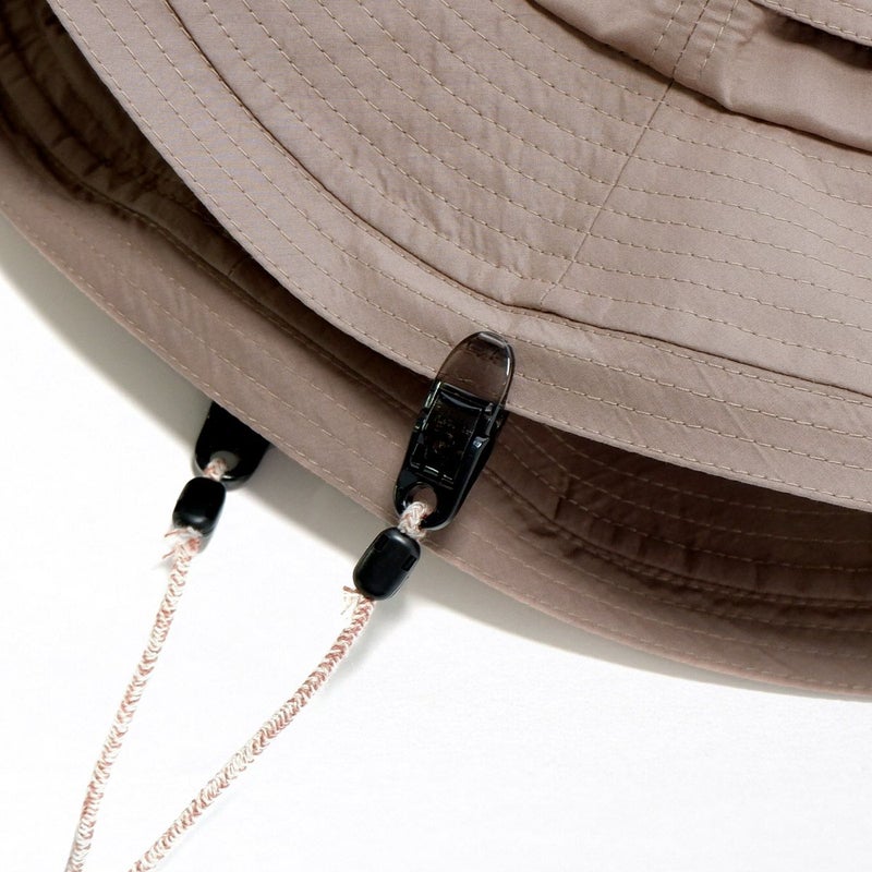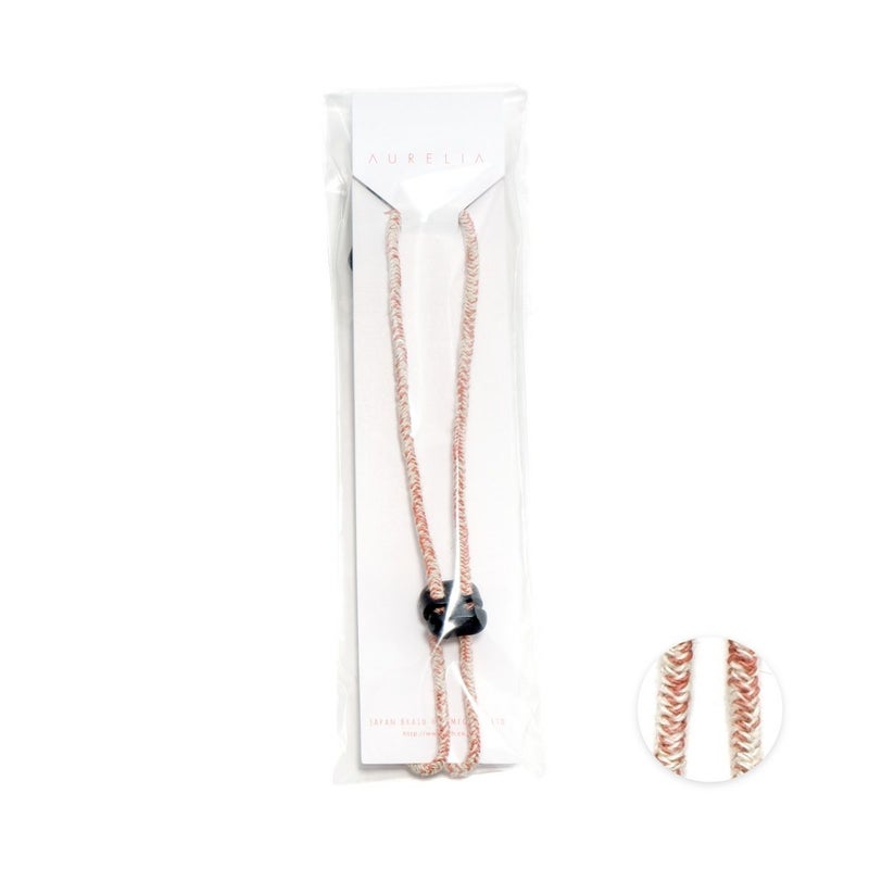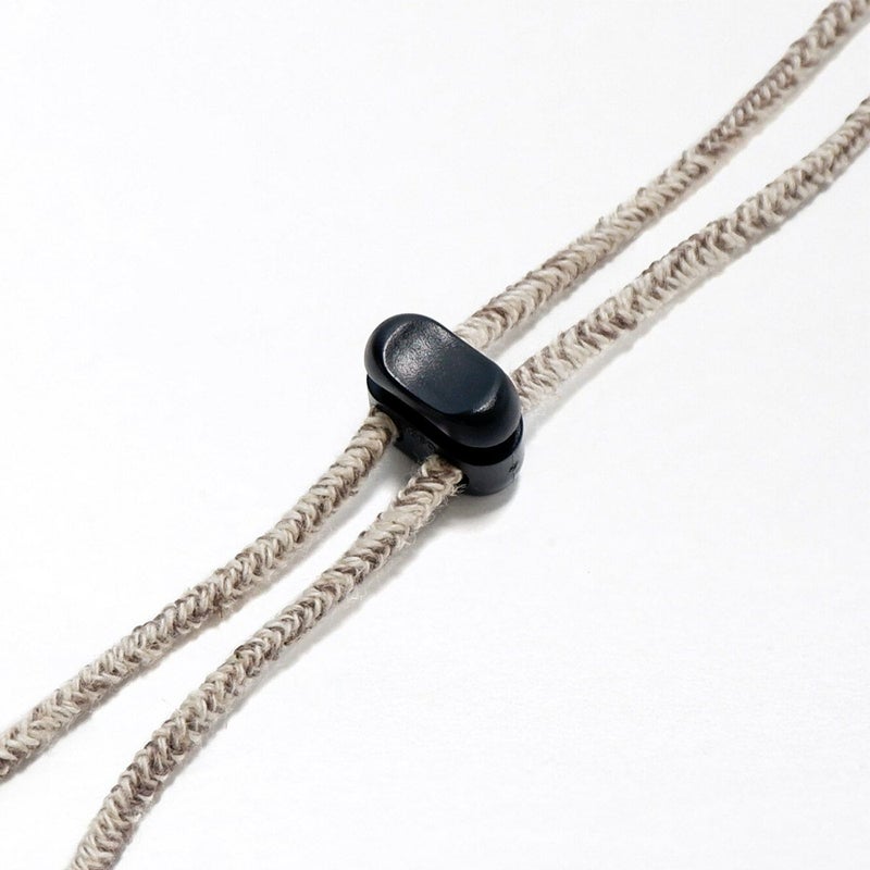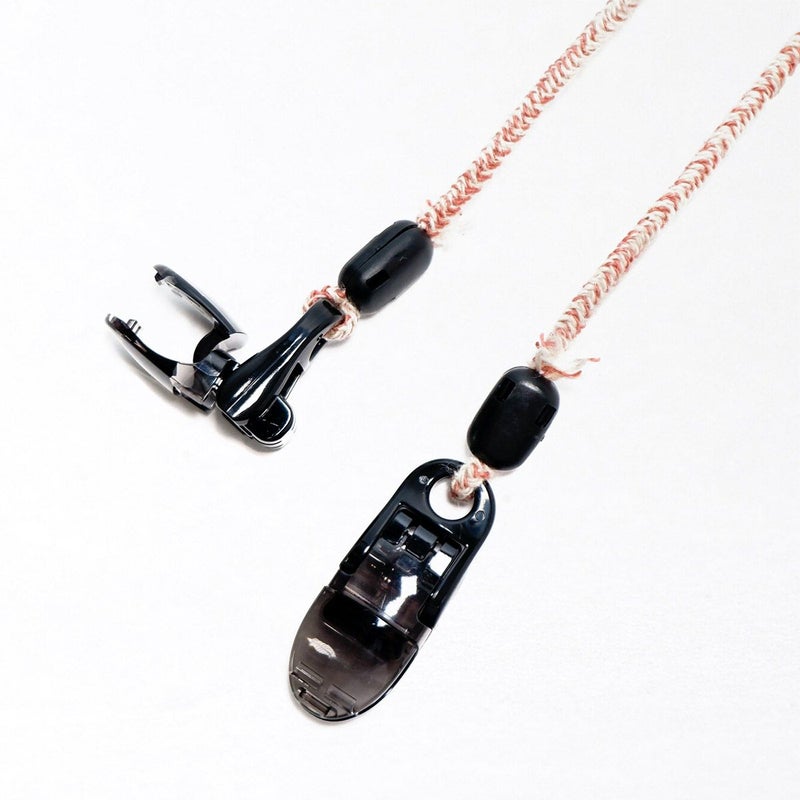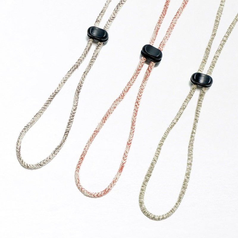 カラー×生成りのミックスカラーがかわいい日本製のハットクリップ/ストラップ。帽子が風で飛ばされるのを防ぎます。風の強い日はもちろん、自転車に乗る際にもひとつあると便利です。帽子の他にもマスクストラップとしてもご利用いただけます。