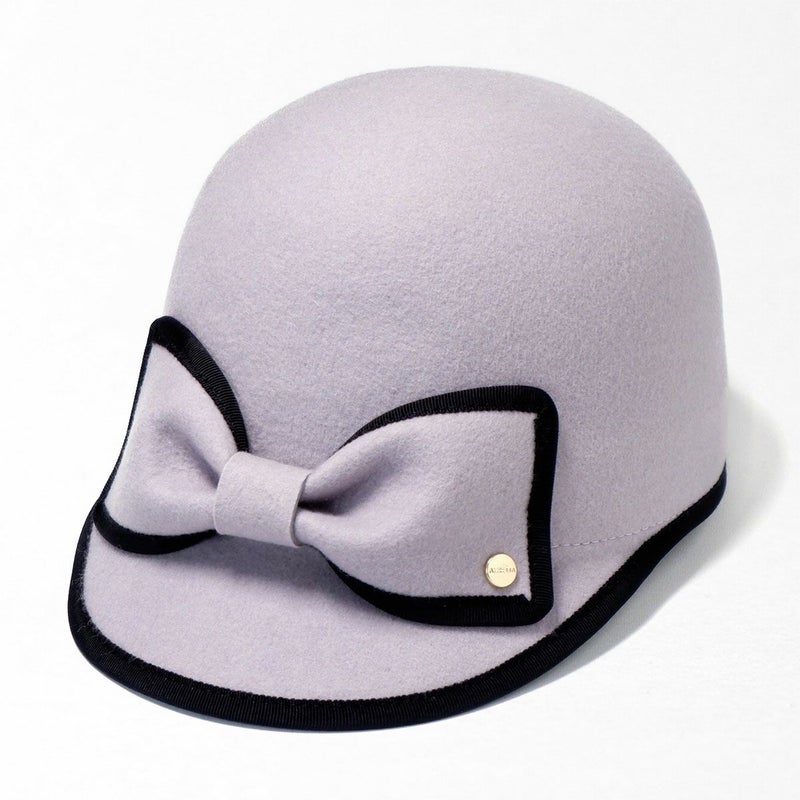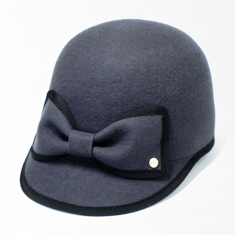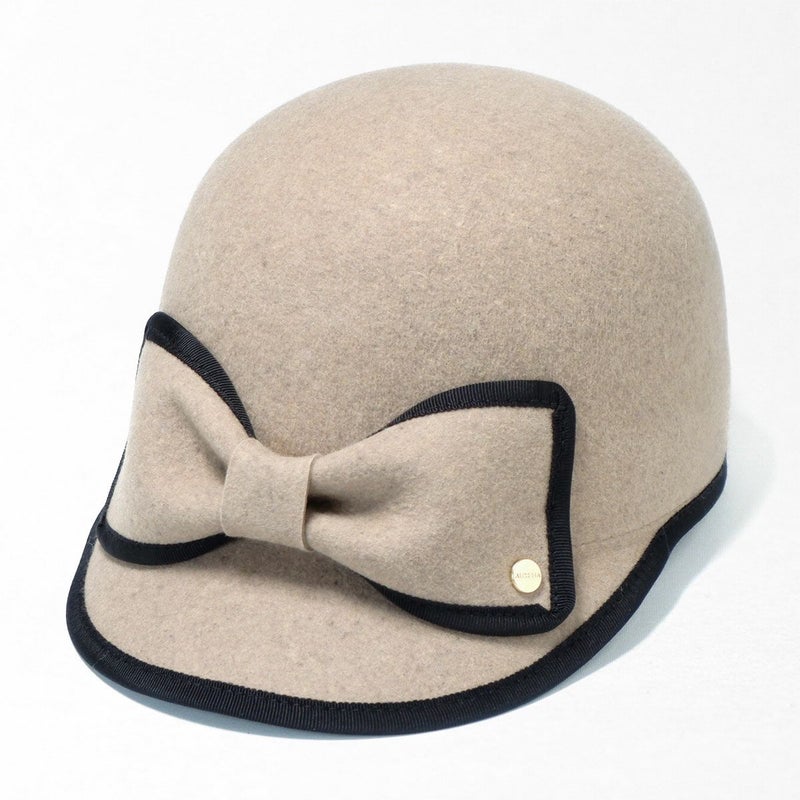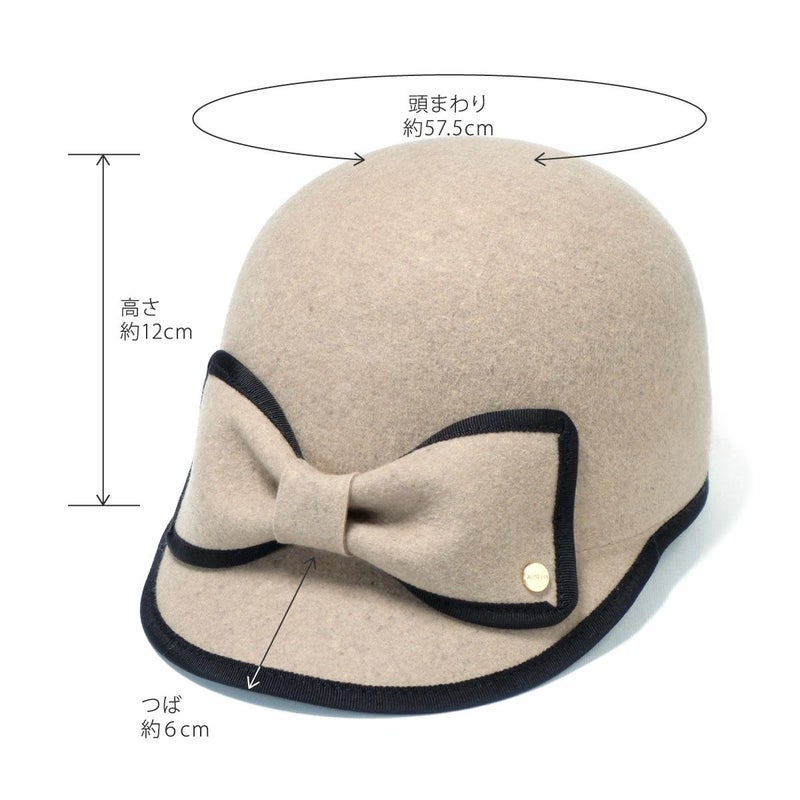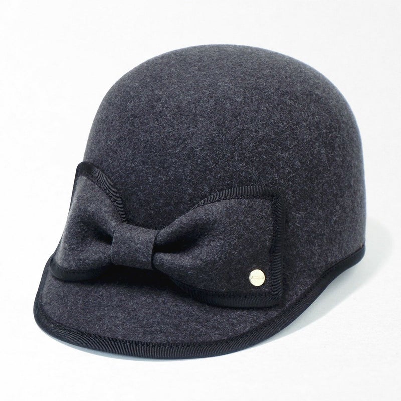 手触りの良い上質なフェルトを丁寧に型入れし、ころんとしたシルエットに仕上げたキャップ。縁取りのグログランリボンはお顔周りの印象を引き締める効果も。短めのつばにパイピング、フロントには大きなリボンをあしらいロゴチャームでアクセントをプラス。キャップでありながら女性らしい装いに仕上げました。