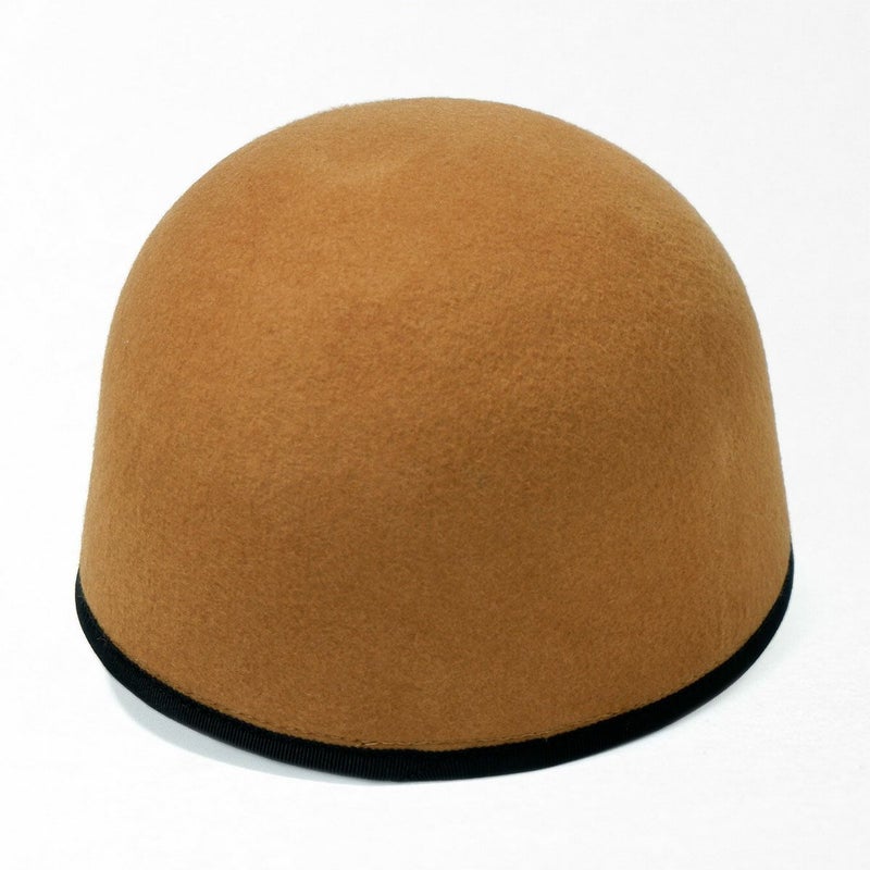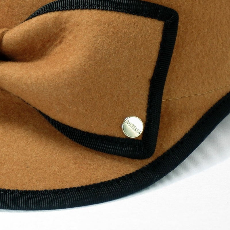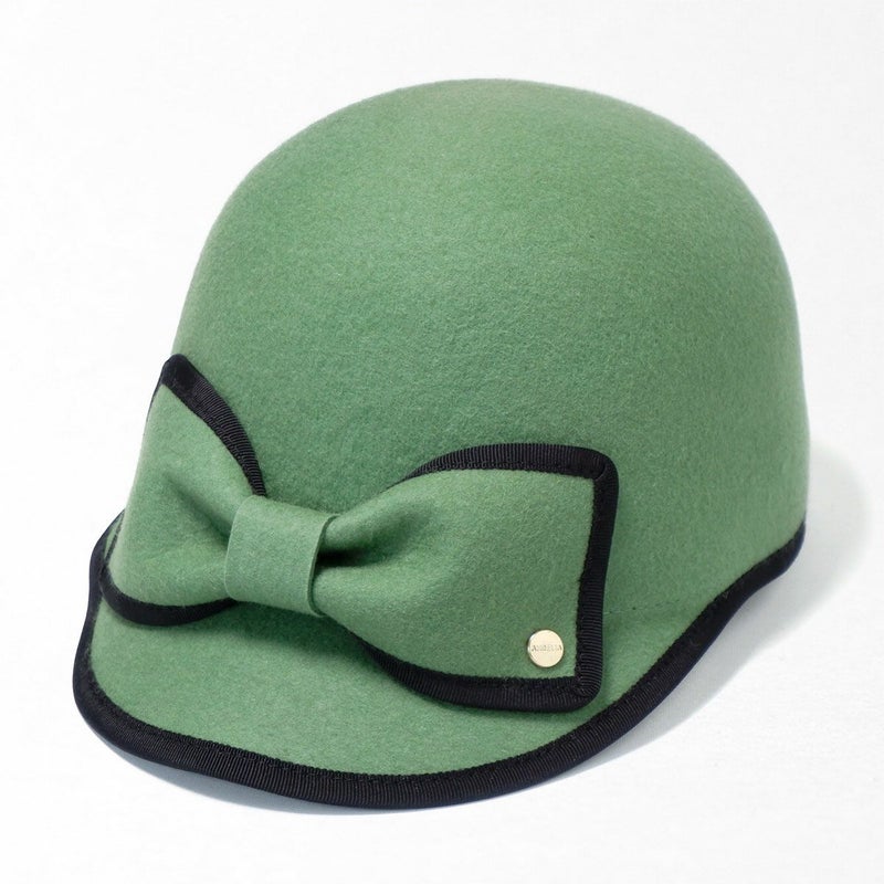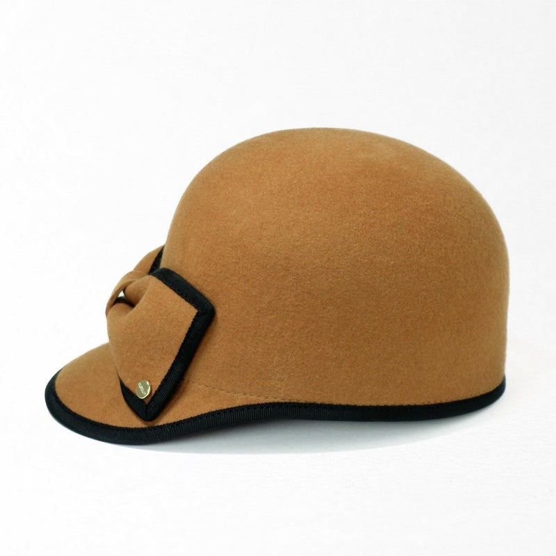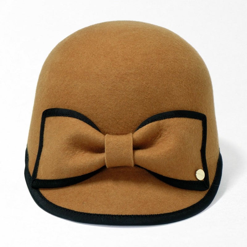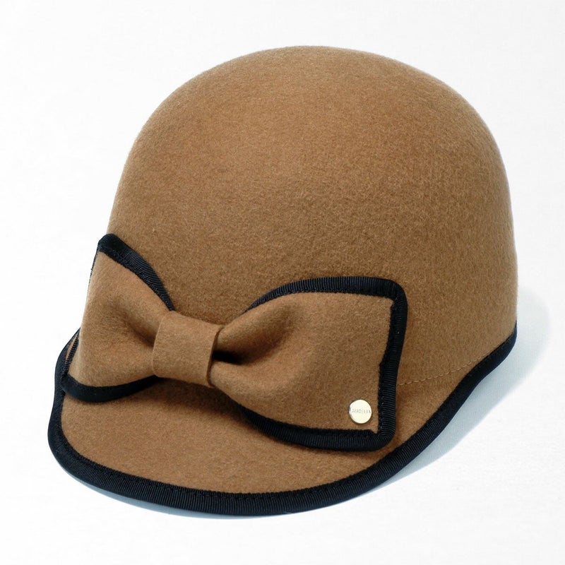 手触りの良い上質なフェルトを丁寧に型入れし、ころんとしたシルエットに仕上げたキャップ。縁取りのグログランリボンはお顔周りの印象を引き締める効果も。短めのつばにパイピング、フロントには大きなリボンをあしらいロゴチャームでアクセントをプラス。キャップでありながら女性らしい装いに仕上げました。