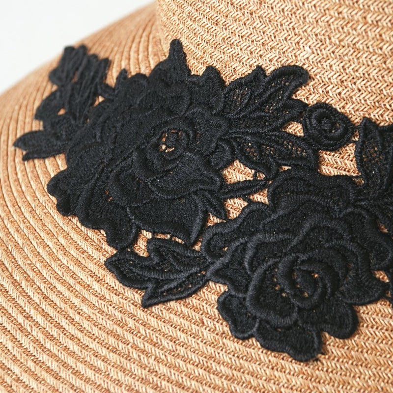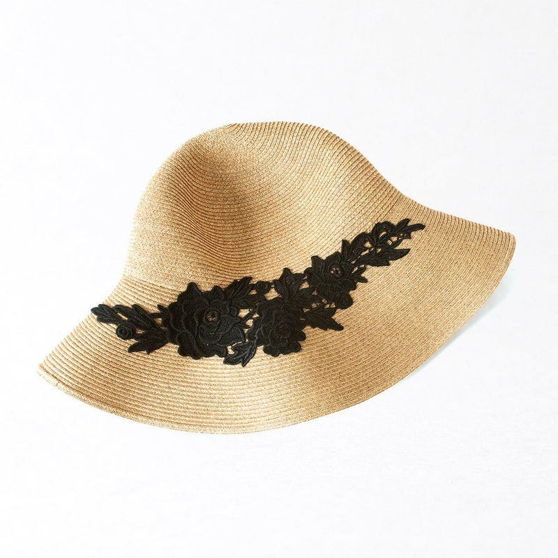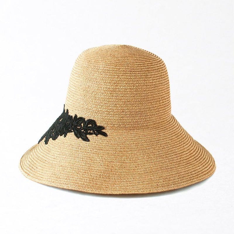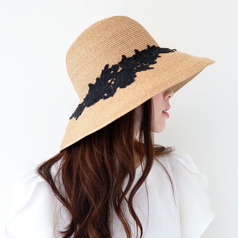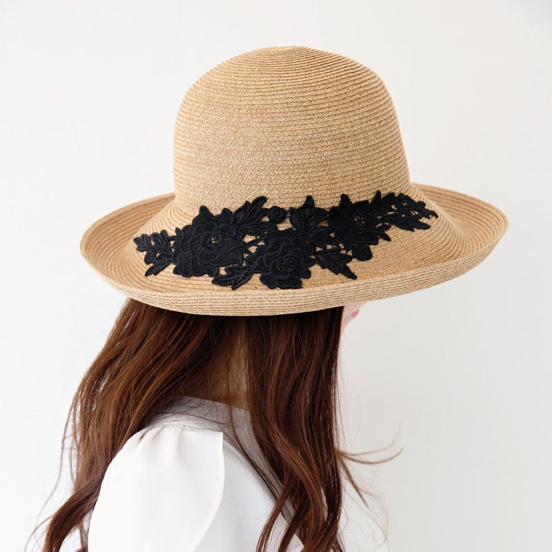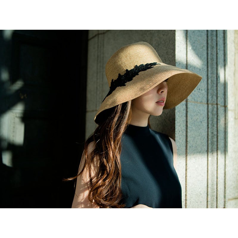 細く丈夫な色褪せが起こりにくい、耐久性のあるブレードを使用したレースブレードハット。鐔が長くしっかり日よけ出来て、ブリムアップにしても綺麗なシルエットで被って頂けます。大きなバラのレースがエレガントな装いを演出します。