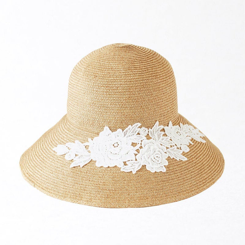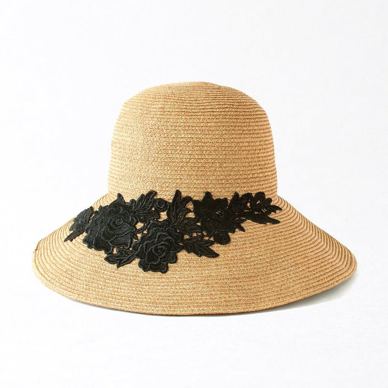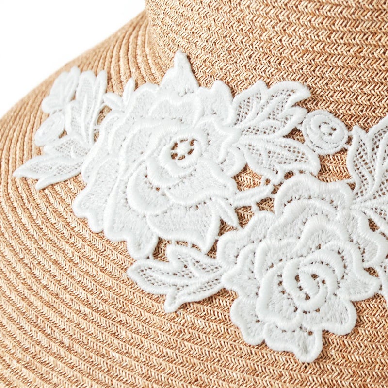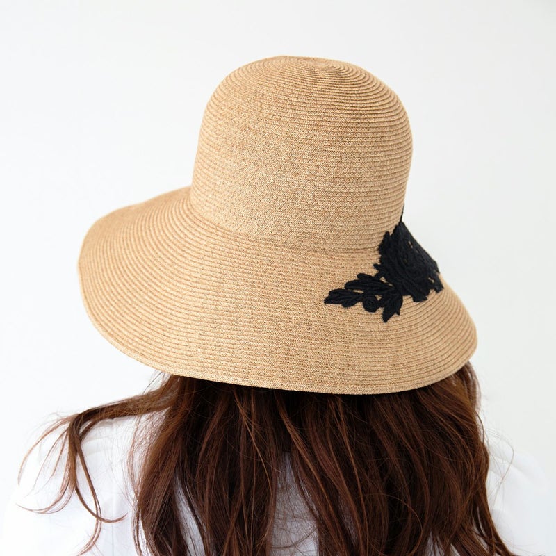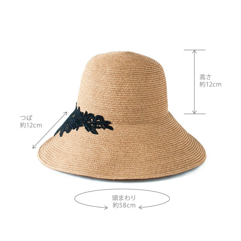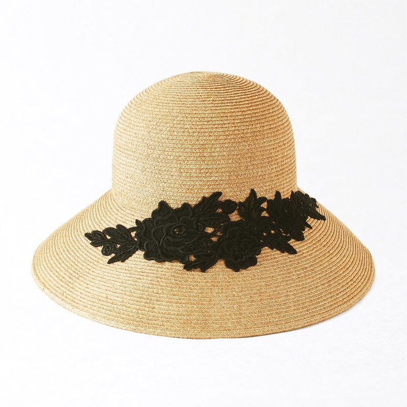 細く丈夫な色褪せが起こりにくい、耐久性のあるブレードを使用したレースブレードハット。鐔が長くしっかり日よけ出来て、ブリムアップにしても綺麗なシルエットで被って頂けます。大きなバラのレースがエレガントな装いを演出します。